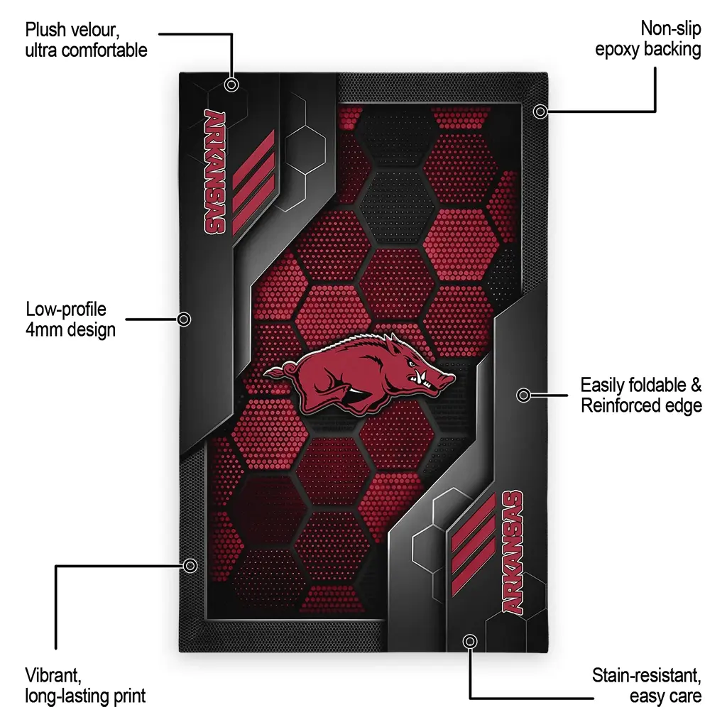 Hit a home run with your favorite team by displaying the Arkansas Razorbacks Rug – Custom Hexagonal Grid Pattern Red from MLB Fan Zone. Featuring a bold team design and crafted with plush velour, this durable sports rug offers ultimate comfort for your home or game-day fan cave. With a quality non-slip grip and stay-flat design, it’s the perfect accessory for any die-hard fan ready to rep their team from the living room to the clubhouse.