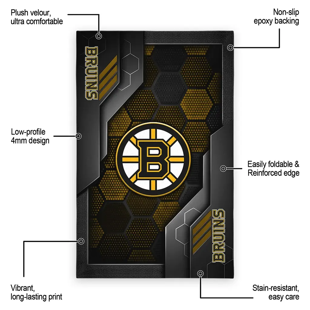Hit a home run with your favorite team by displaying the Boston Bruins Rug – Personalized Hexagonal Grid Pattern Gold from MLB Fan Zone. Featuring a bold team design and crafted with plush velour, this durable sports rug offers ultimate comfort for your home or game-day fan cave. With a quality non-slip grip and stay-flat design, it’s the perfect accessory for any die-hard fan ready to rep their team from the living room to the clubhouse.