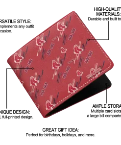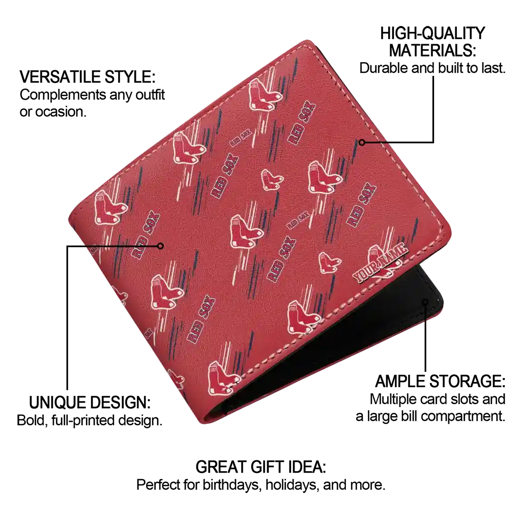 Hit a home run with Boston Red Sox by wearing the Custom Boston Red Sox Streak Motif Red Wallet. Featuring a bold team design and crafted with premium materials, this durable sports wallet offers plenty of space for your cards, cash, and game-day essentials. With a secure fold-over closure, it’s the perfect accessory for any die-hard fan ready to rep their team, from the dugout to the streets.