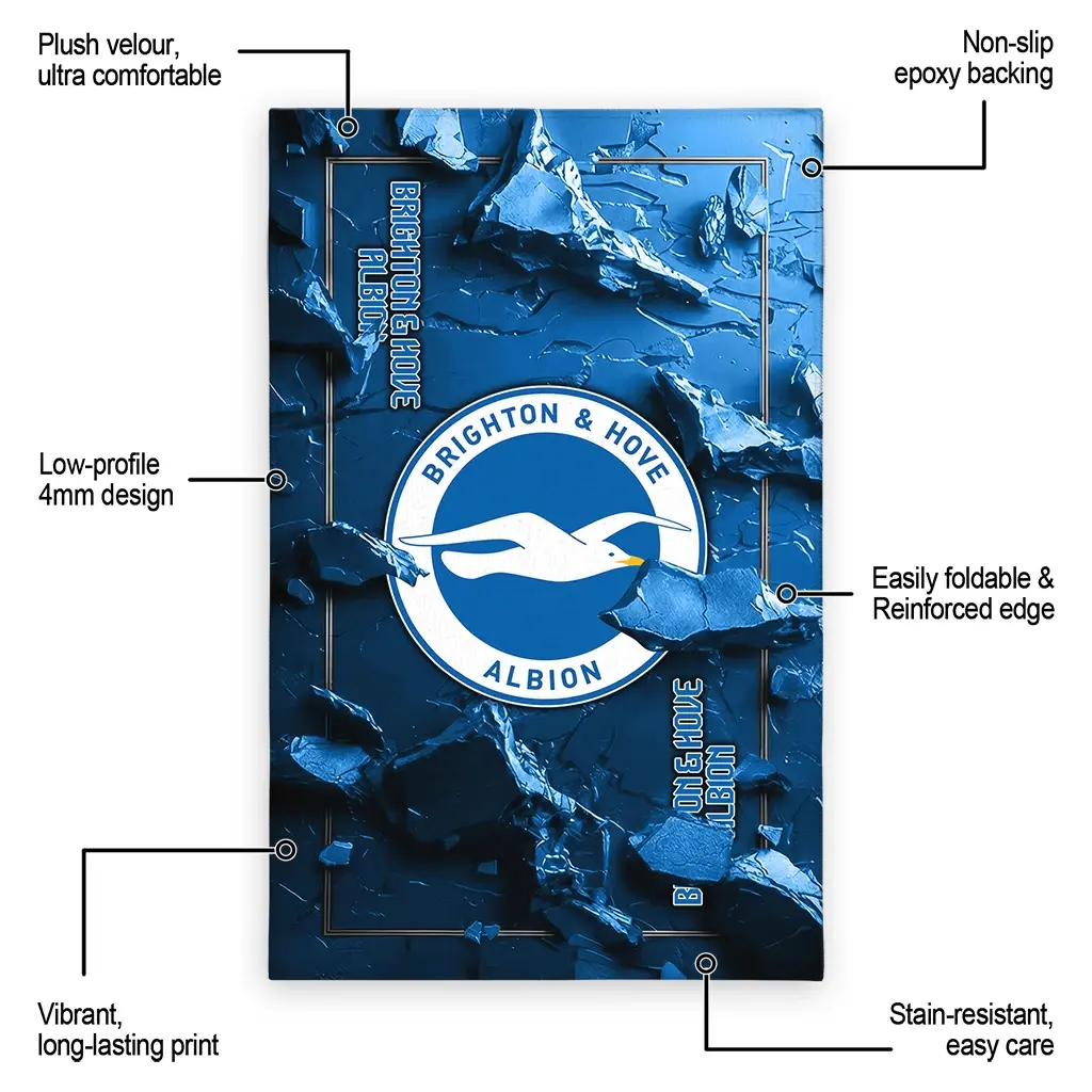 Hit a home run with your favorite team by displaying the Brighton & Hove Albion Rug – Custom Cracked Surface Design Blue from MLB Fan Zone. Featuring a bold team design and crafted with plush velour, this durable sports rug offers ultimate comfort for your home or game-day fan cave. With a quality non-slip grip and stay-flat design, it’s the perfect accessory for any die-hard fan ready to rep their team from the living room to the clubhouse.