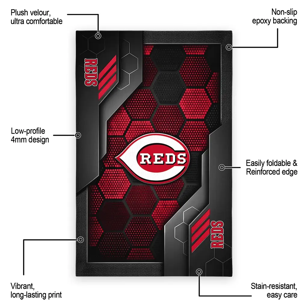 Hit a home run with your favorite team by displaying the Cincinnati Reds Rug – Custom Hexagonal Grid Pattern Red from MLB Fan Zone. Featuring a bold team design and crafted with plush velour, this durable sports rug offers ultimate comfort for your home or game-day fan cave. With a quality non-slip grip and stay-flat design, it’s the perfect accessory for any die-hard fan ready to rep their team from the living room to the clubhouse.