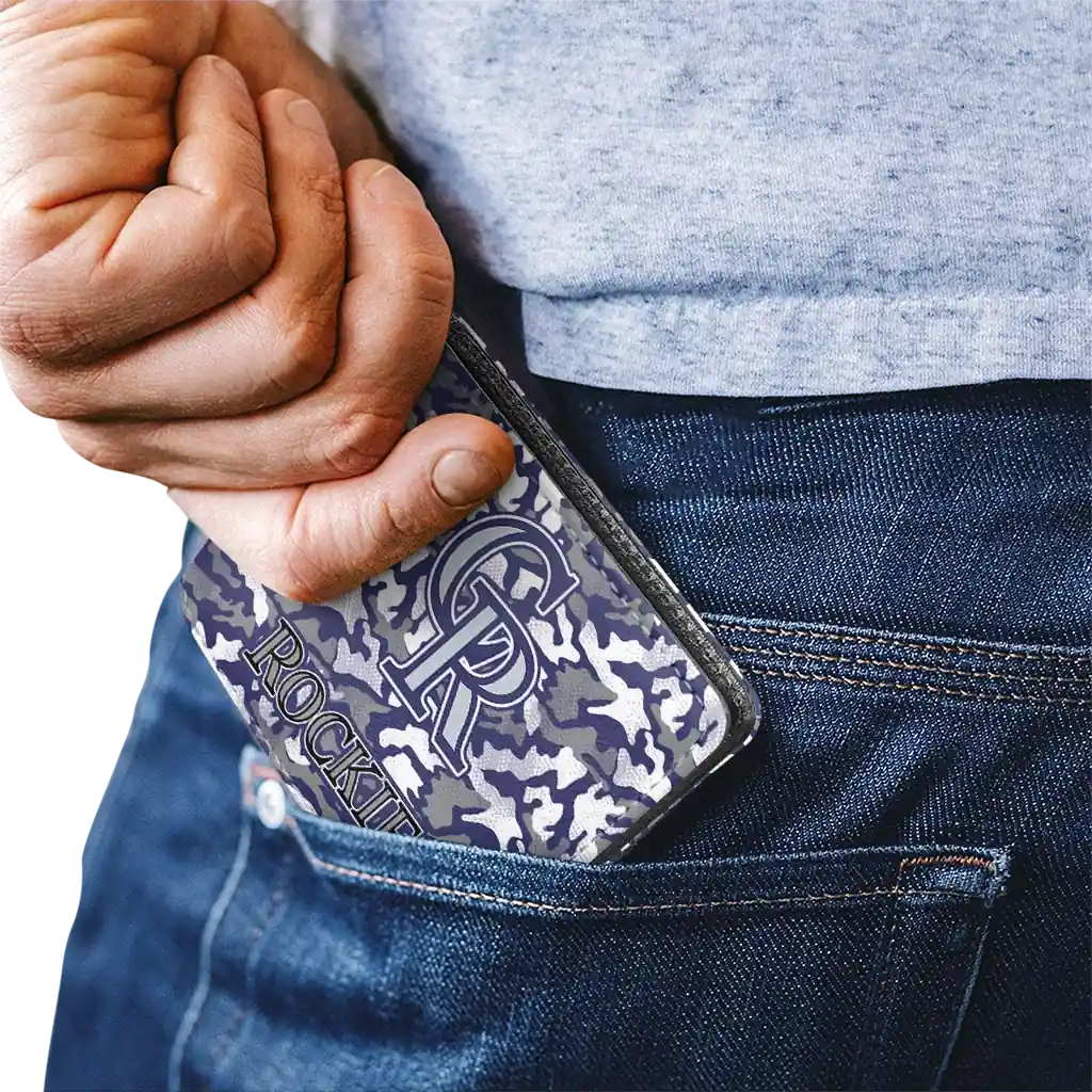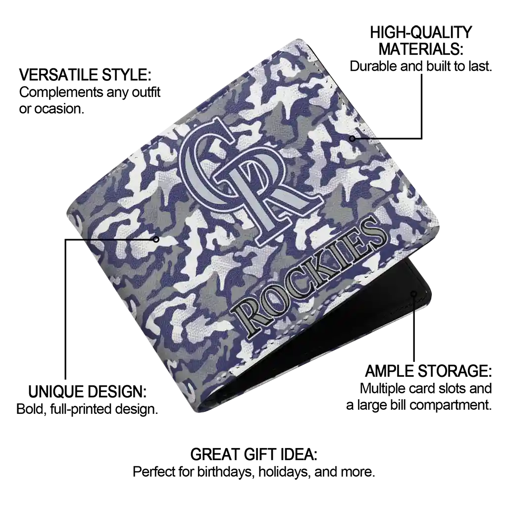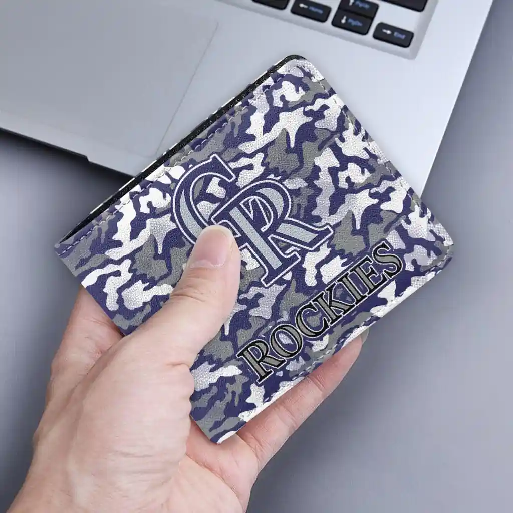 Hit a home run with Colorado Rockies by wearing the Colorado Rockies Camouflage Patches Blue White Wallet. Featuring a bold team design and crafted with premium materials, this durable sports wallet offers plenty of space for your cards, cash, and game-day essentials. With a secure fold-over closure, it’s the perfect accessory for any die-hard fan ready to rep their team, from the dugout to the streets.