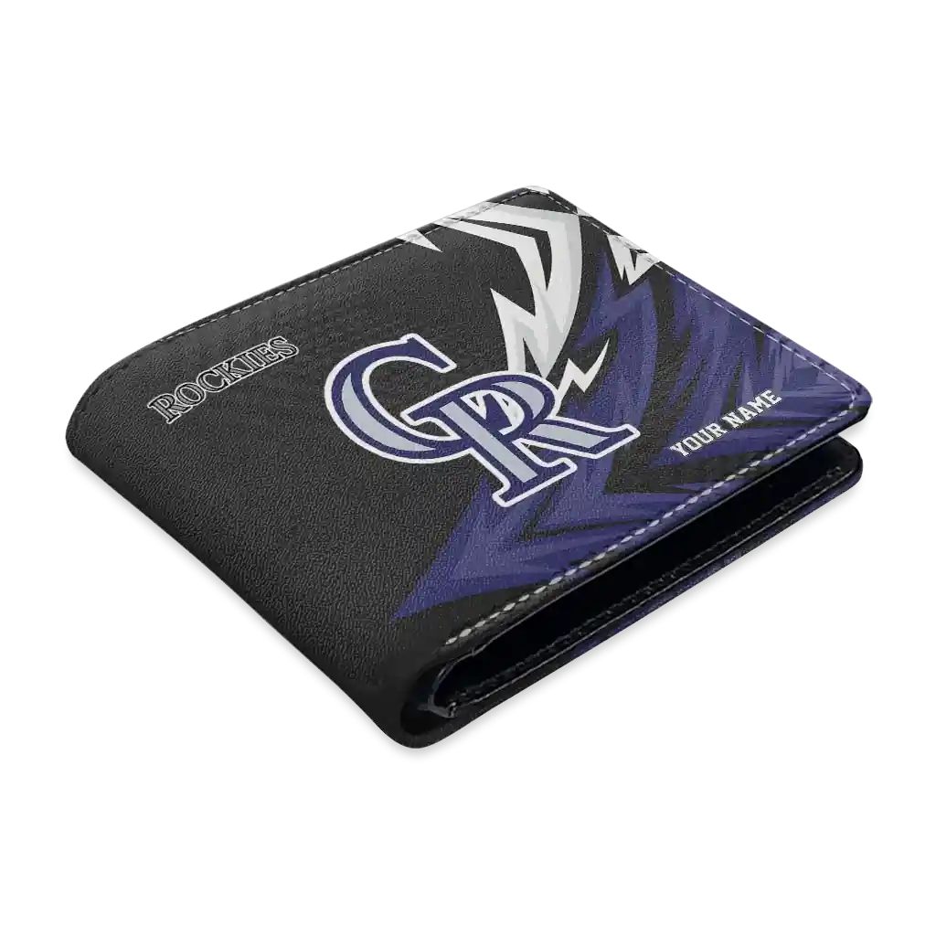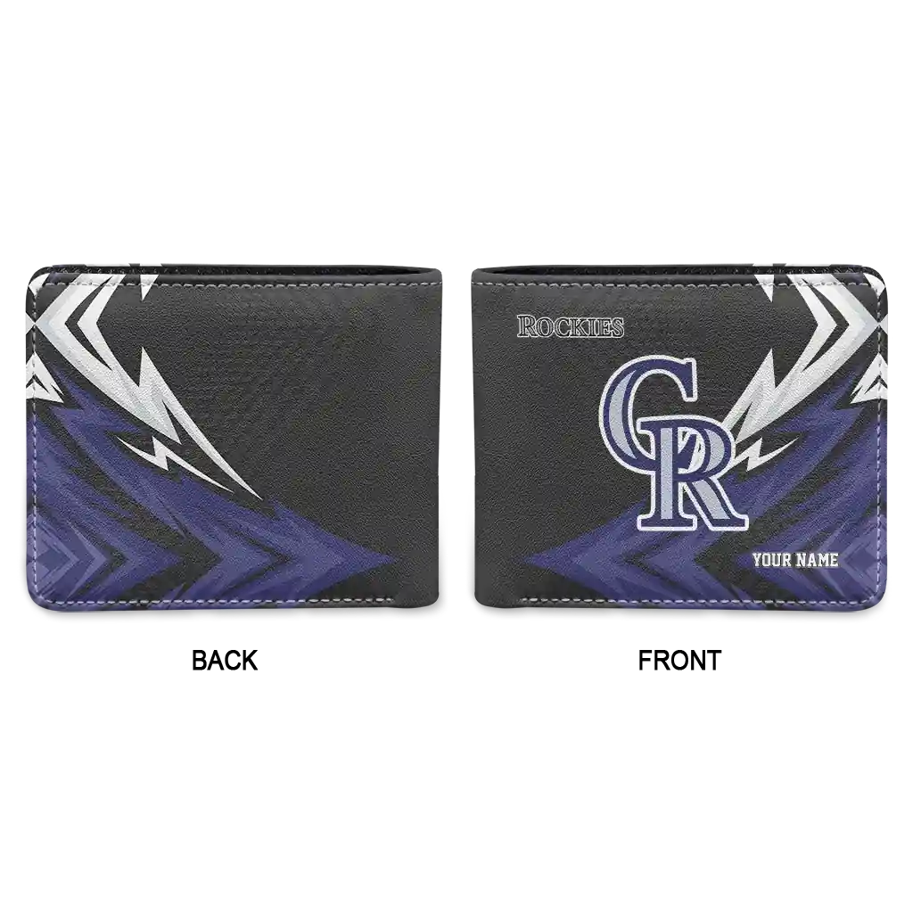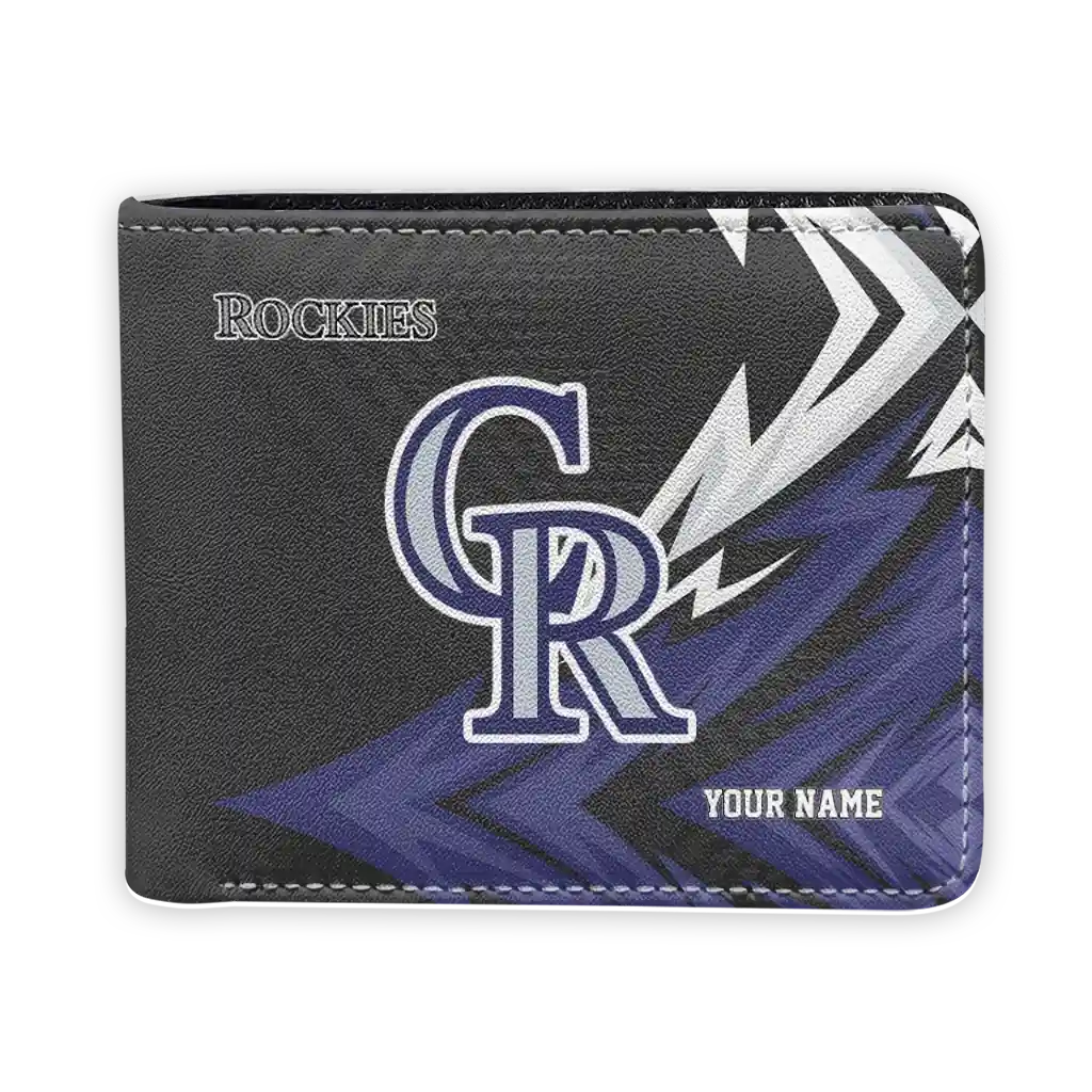Hit a home run with Colorado Rockies by wearing the Personalized Colorado Rockies Sharp Arrow Streaks Blue Black Wallet. Featuring a bold team design and crafted with premium materials, this durable sports wallet offers plenty of space for your cards, cash, and game-day essentials. With a secure fold-over closure, it’s the perfect accessory for any die-hard fan ready to rep their team, from the dugout to the streets.