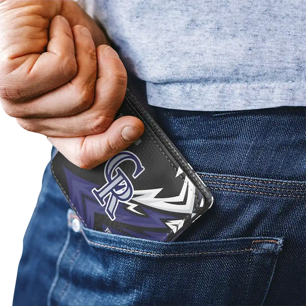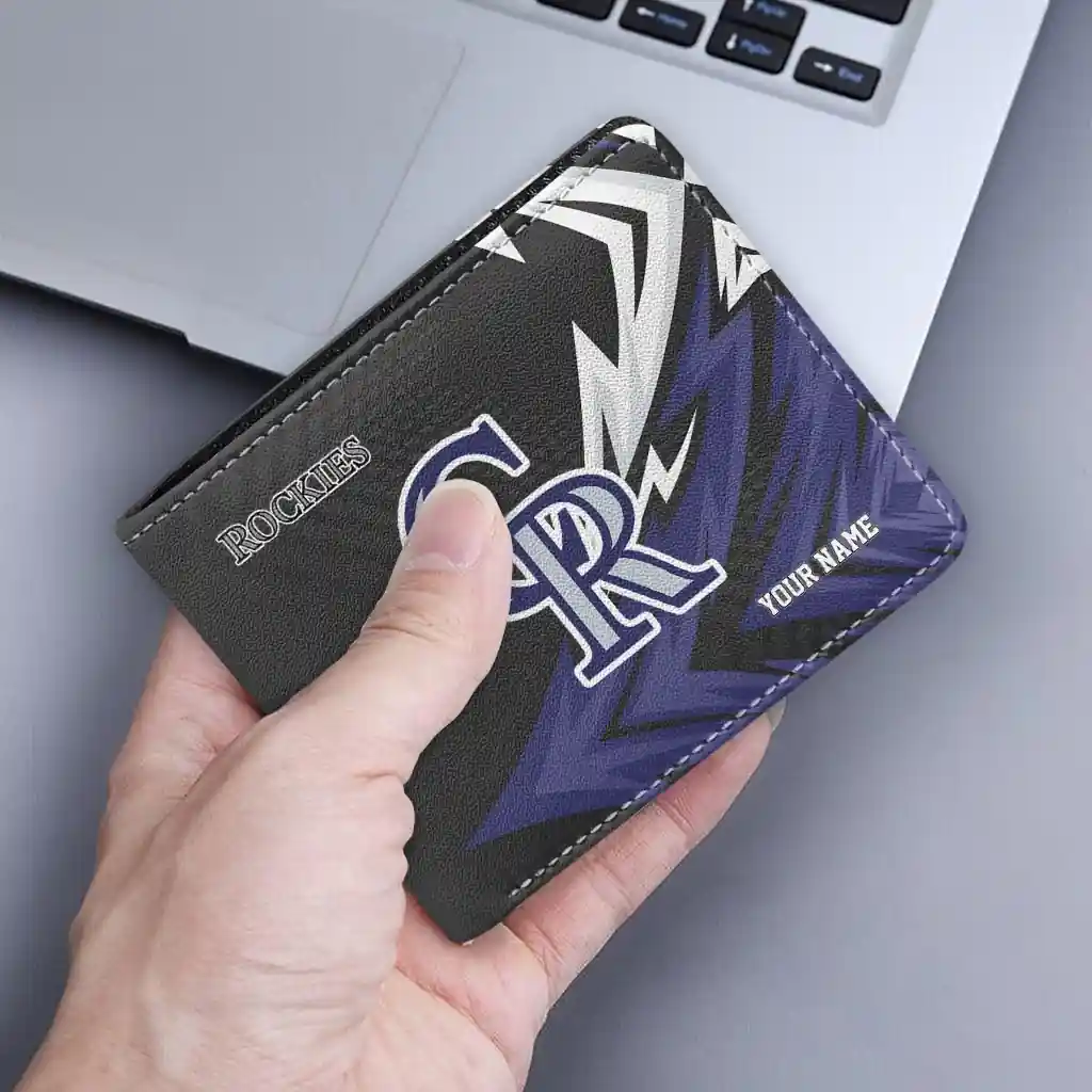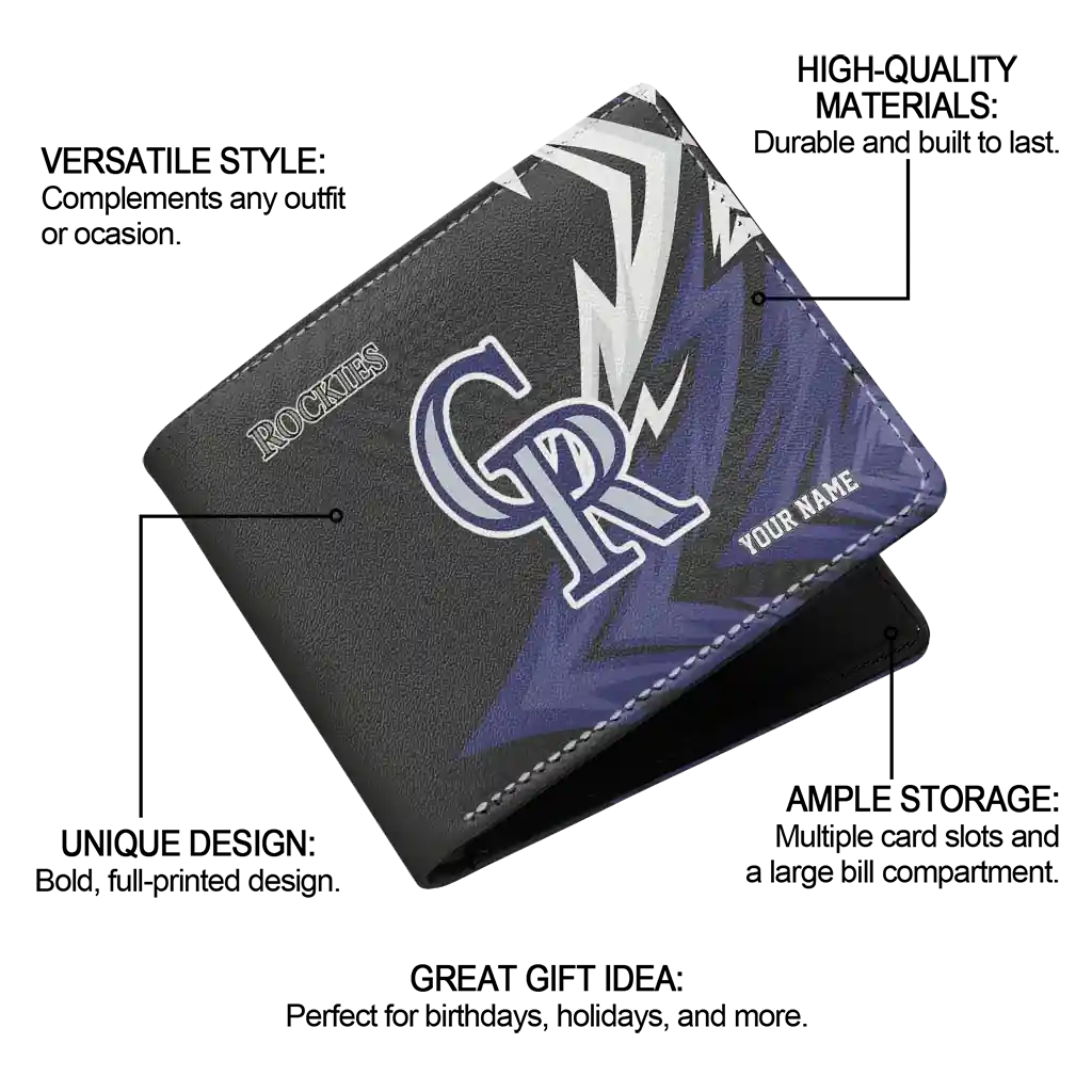 Hit a home run with Colorado Rockies by wearing the Personalized Colorado Rockies Sharp Arrow Streaks Blue Black Wallet. Featuring a bold team design and crafted with premium materials, this durable sports wallet offers plenty of space for your cards, cash, and game-day essentials. With a secure fold-over closure, it’s the perfect accessory for any die-hard fan ready to rep their team, from the dugout to the streets.