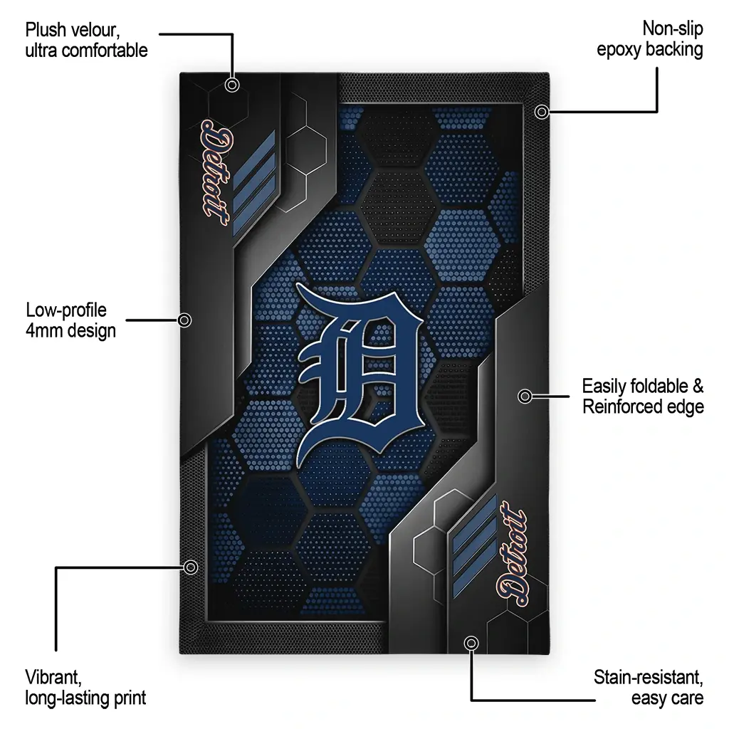 Hit a home run with your favorite team by displaying the Detroit Tigers Rug – Custom Hexagonal Grid Pattern Navy from MLB Fan Zone. Featuring a bold team design and crafted with plush velour, this durable sports rug offers ultimate comfort for your home or game-day fan cave. With a quality non-slip grip and stay-flat design, it’s the perfect accessory for any die-hard fan ready to rep their team from the living room to the clubhouse.