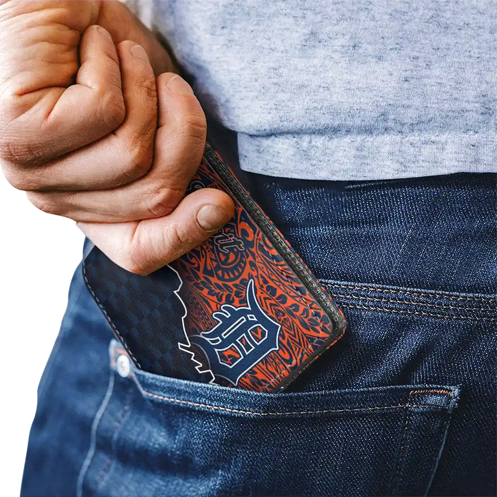 Hit a home run with Detroit Tigers by wearing the Detroit Tigers Tribal Fade Fusion Navy Black Wallet. Featuring a bold team design and crafted with premium materials, this durable sports wallet offers plenty of space for your cards, cash, and game-day essentials. With a secure fold-over closure, it’s the perfect accessory for any die-hard fan ready to rep their team, from the dugout to the streets.