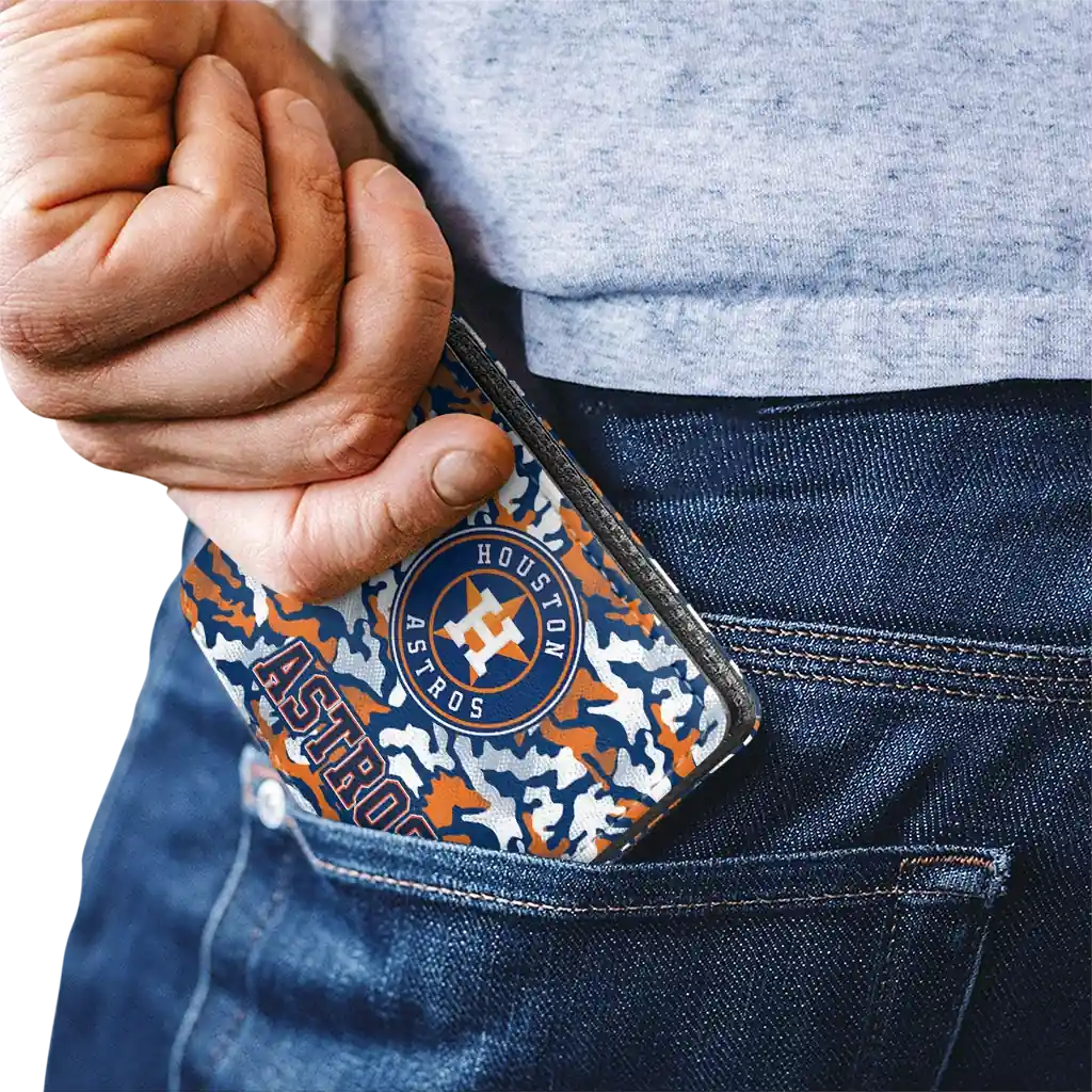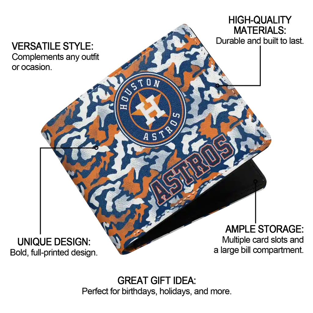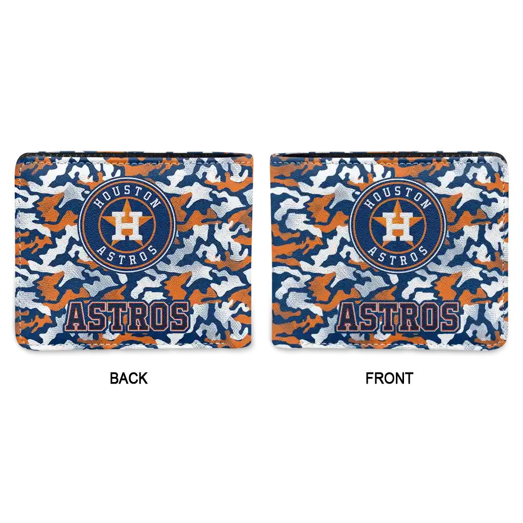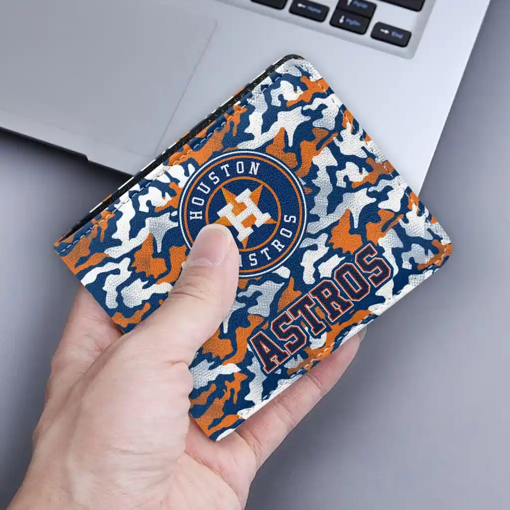 Hit a home run with Houston Astros by wearing the Houston Astros Camouflage Patches Blue White Wallet. Featuring a bold team design and crafted with premium materials, this durable sports wallet offers plenty of space for your cards, cash, and game-day essentials. With a secure fold-over closure, it’s the perfect accessory for any die-hard fan ready to rep their team, from the dugout to the streets.