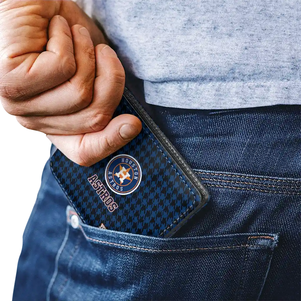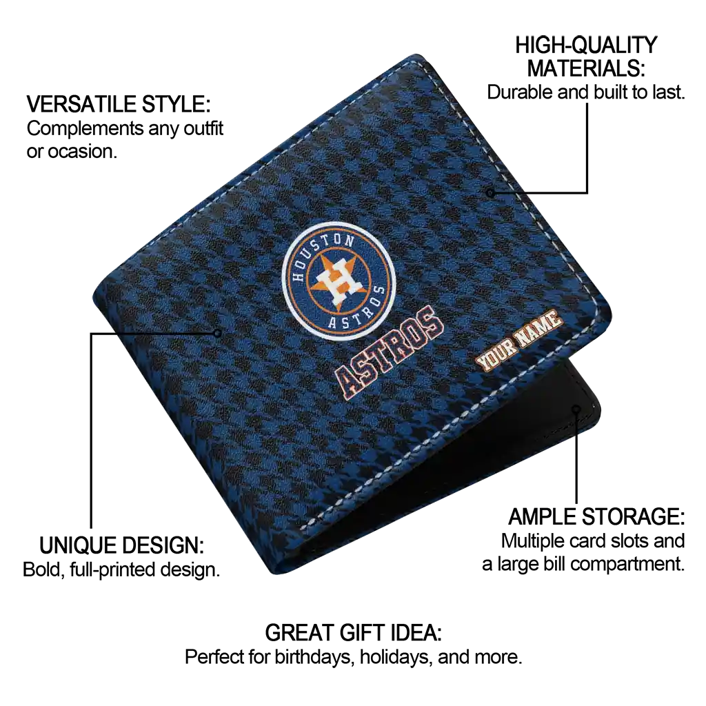 Hit a home run with Houston Astros by wearing the Customized Houston Astros Classic Houndstooth Blue Wallet. Featuring a bold team design and crafted with premium materials, this durable sports wallet offers plenty of space for your cards, cash, and game-day essentials. With a secure fold-over closure, it’s the perfect accessory for any die-hard fan ready to rep their team, from the dugout to the streets.
