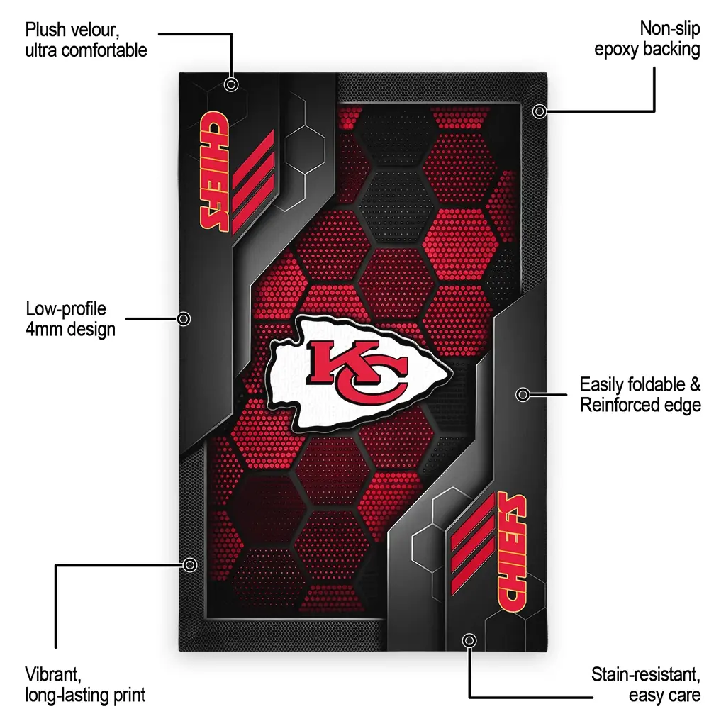 Hit a home run with your favorite team by displaying the Kansas City Chiefs Rug – Customized Hexagonal Grid Pattern Red from MLB Fan Zone. Featuring a bold team design and crafted with plush velour, this durable sports rug offers ultimate comfort for your home or game-day fan cave. With a quality non-slip grip and stay-flat design, it’s the perfect accessory for any die-hard fan ready to rep their team from the living room to the clubhouse.