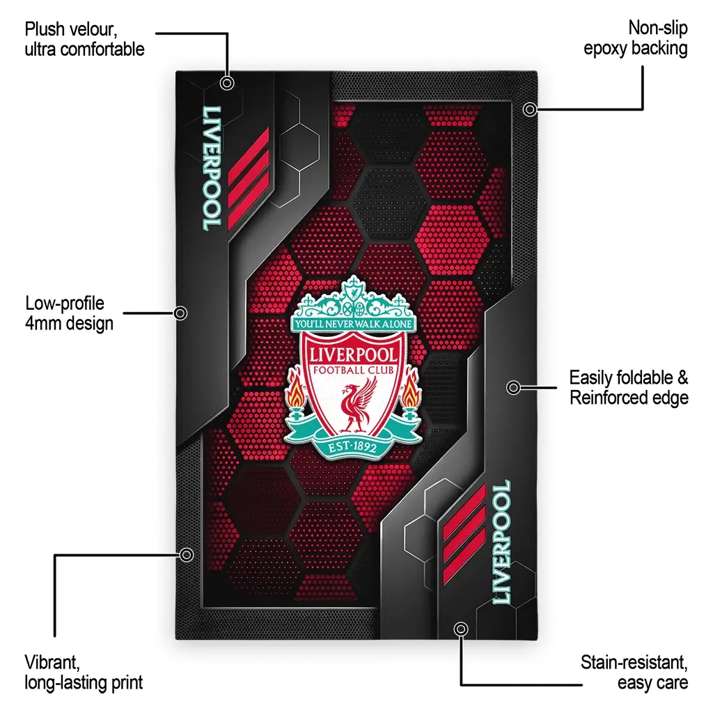 Hit a home run with your favorite team by displaying the Liverpool Rug – Custom Hexagonal Grid Pattern Red from MLB Fan Zone. Featuring a bold team design and crafted with plush velour, this durable sports rug offers ultimate comfort for your home or game-day fan cave. With a quality non-slip grip and stay-flat design, it’s the perfect accessory for any die-hard fan ready to rep their team from the living room to the clubhouse.