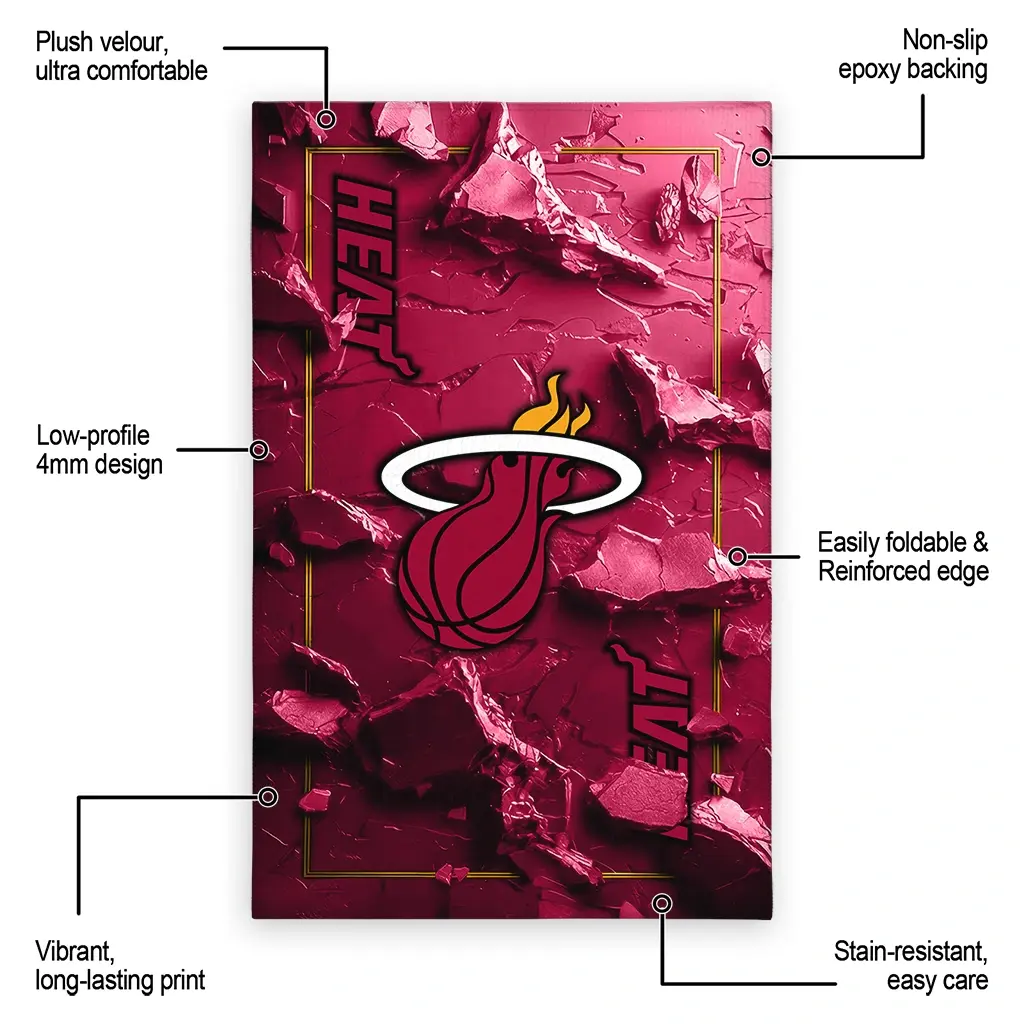 Hit a home run with your favorite team by displaying the Miami Heat Rug – Customized Cracked Surface Design Red from MLB Fan Zone. Featuring a bold team design and crafted with plush velour, this durable sports rug offers ultimate comfort for your home or game-day fan cave. With a quality non-slip grip and stay-flat design, it’s the perfect accessory for any die-hard fan ready to rep their team from the living room to the clubhouse.