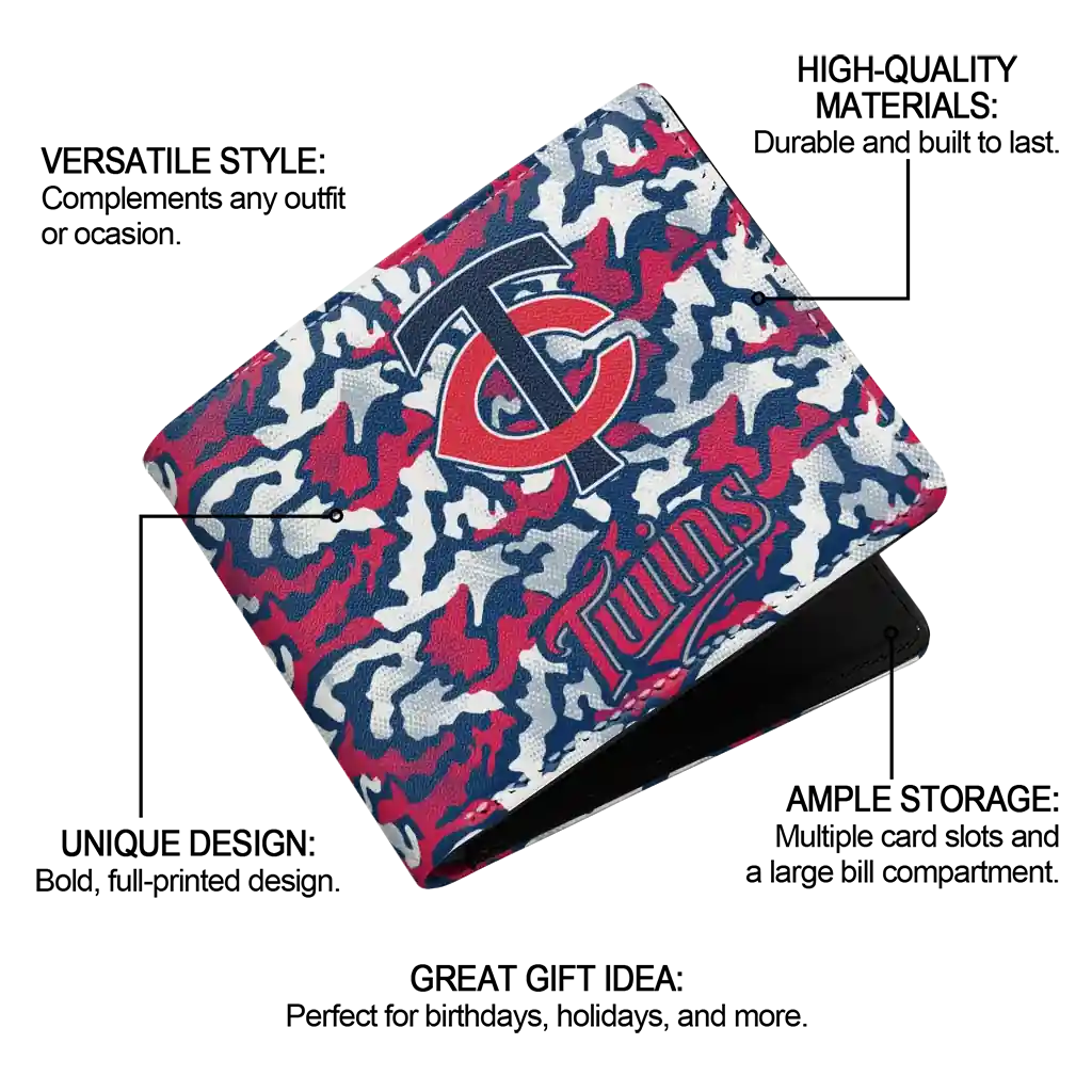 Hit a home run with Minnesota Twins by wearing the Minnesota Twins Camouflage Patches Navy White Wallet. Featuring a bold team design and crafted with premium materials, this durable sports wallet offers plenty of space for your cards, cash, and game-day essentials. With a secure fold-over closure, it’s the perfect accessory for any die-hard fan ready to rep their team, from the dugout to the streets.