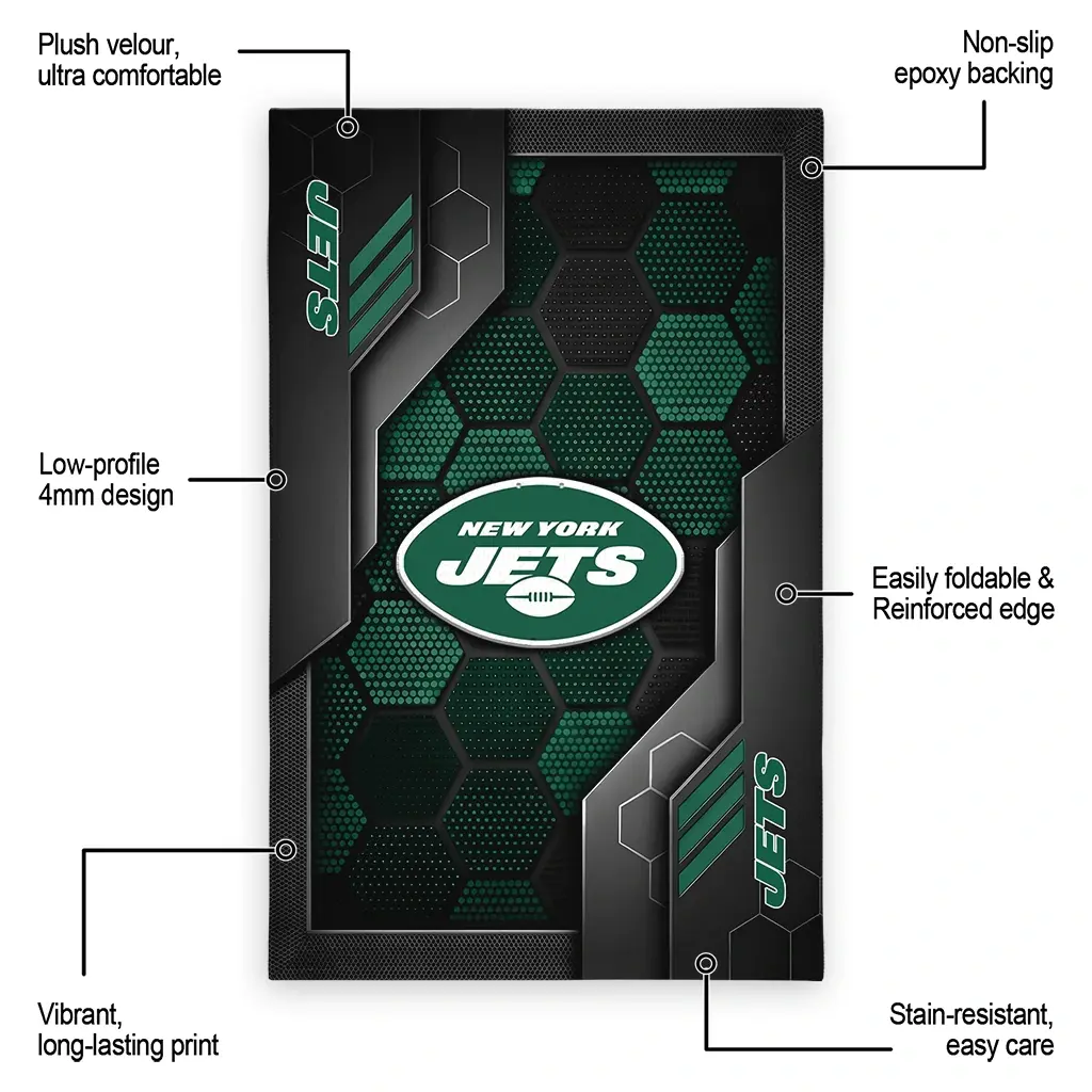 Hit a home run with your favorite team by displaying the New York Jets Rug – Customized Hexagonal Grid Pattern Green from MLB Fan Zone. Featuring a bold team design and crafted with plush velour, this durable sports rug offers ultimate comfort for your home or game-day fan cave. With a quality non-slip grip and stay-flat design, it’s the perfect accessory for any die-hard fan ready to rep their team from the living room to the clubhouse.