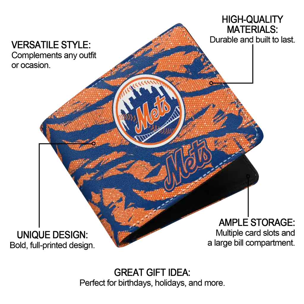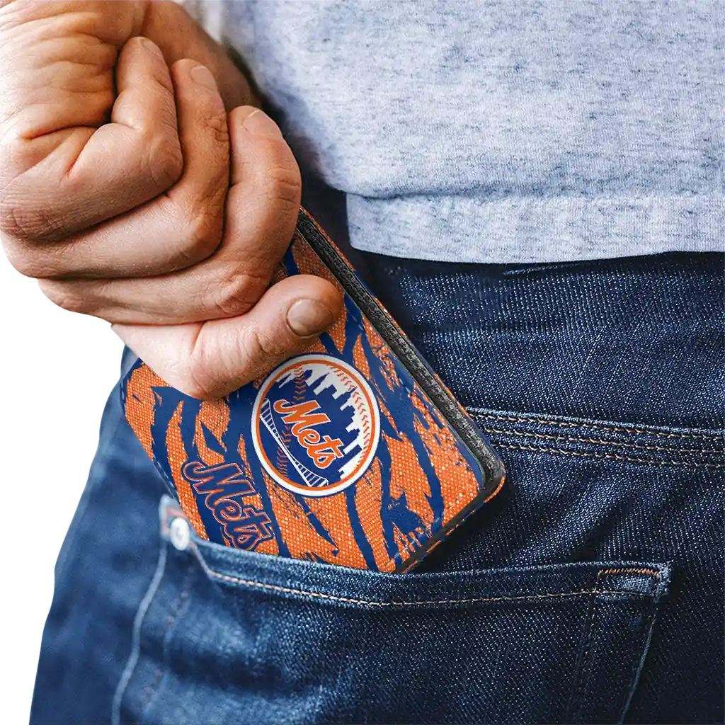 Hit a home run with New York Mets by wearing the New York Mets Abstract Stripes Blue Wallet. Featuring a bold team design and crafted with premium materials, this durable sports wallet offers plenty of space for your cards, cash, and game-day essentials. With a secure fold-over closure, it’s the perfect accessory for any die-hard fan ready to rep their team, from the dugout to the streets.