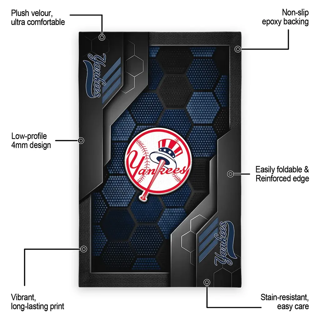 Hit a home run with your favorite team by displaying the New York Yankees Rug – Custom Hexagonal Grid Pattern Navy from MLB Fan Zone. Featuring a bold team design and crafted with plush velour, this durable sports rug offers ultimate comfort for your home or game-day fan cave. With a quality non-slip grip and stay-flat design, it’s the perfect accessory for any die-hard fan ready to rep their team from the living room to the clubhouse.