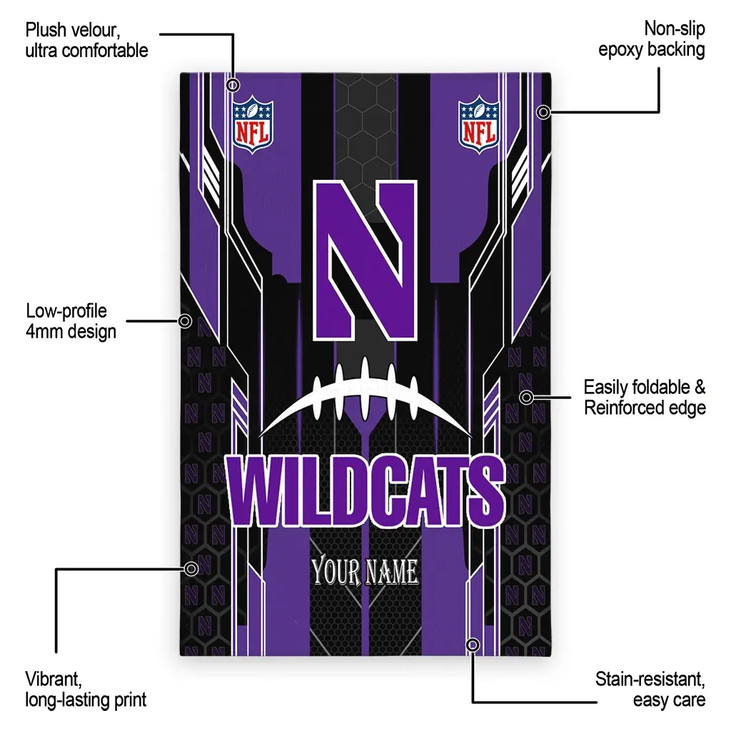 Hit a home run with your favorite team by displaying the Northwestern Wildcats Rug – Personalized Football Laces Purple from MLB Fan Zone. Featuring a bold team design and crafted with plush velour, this durable sports rug offers ultimate comfort for your home or game-day fan cave. With a quality non-slip grip and stay-flat design, it’s the perfect accessory for any die-hard fan ready to rep their team from the living room to the clubhouse.