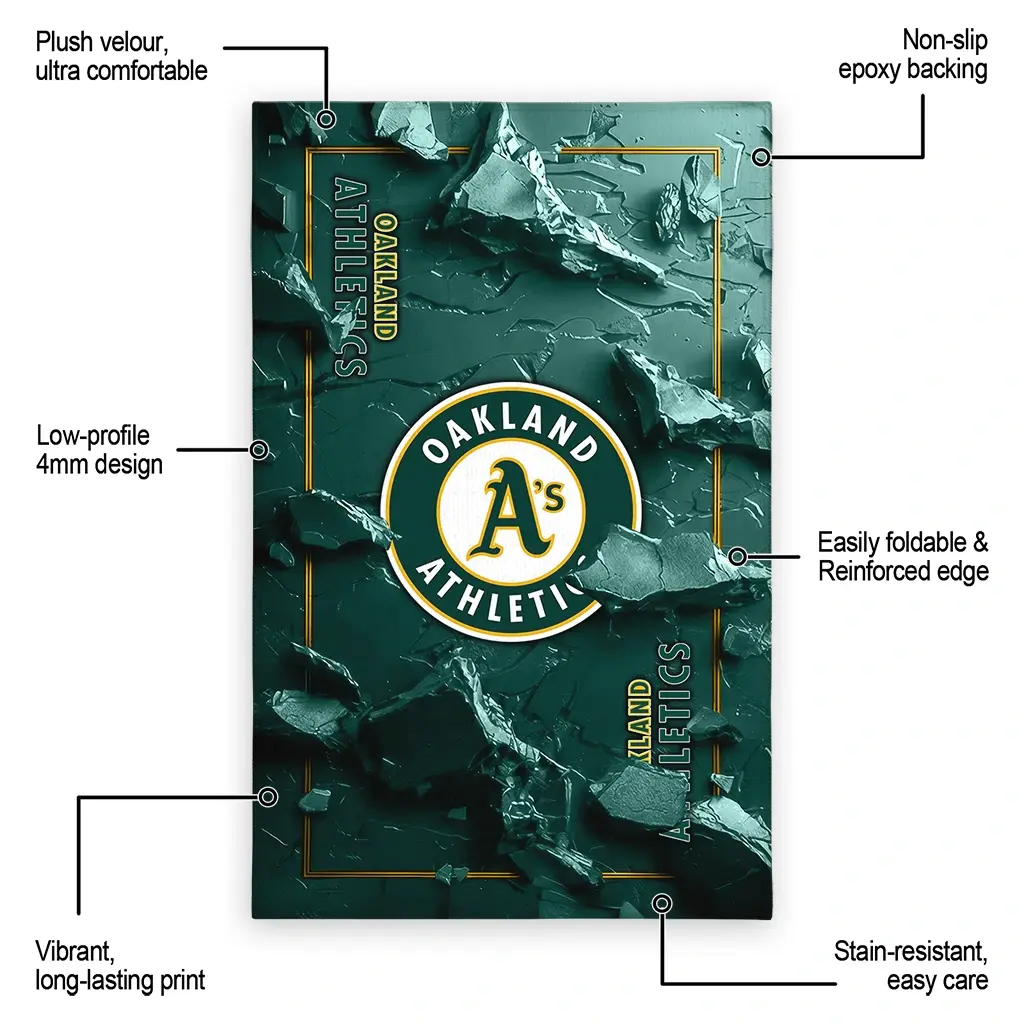 Hit a home run with your favorite team by displaying the Oakland Athletics Rug – Personalized Cracked Surface Design Green from MLB Fan Zone. Featuring a bold team design and crafted with plush velour, this durable sports rug offers ultimate comfort for your home or game-day fan cave. With a quality non-slip grip and stay-flat design, it’s the perfect accessory for any die-hard fan ready to rep their team from the living room to the clubhouse.