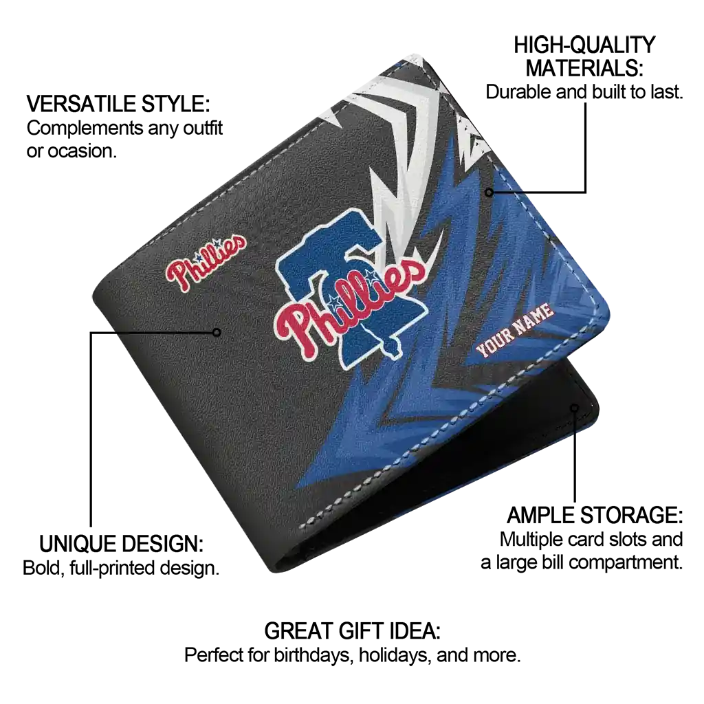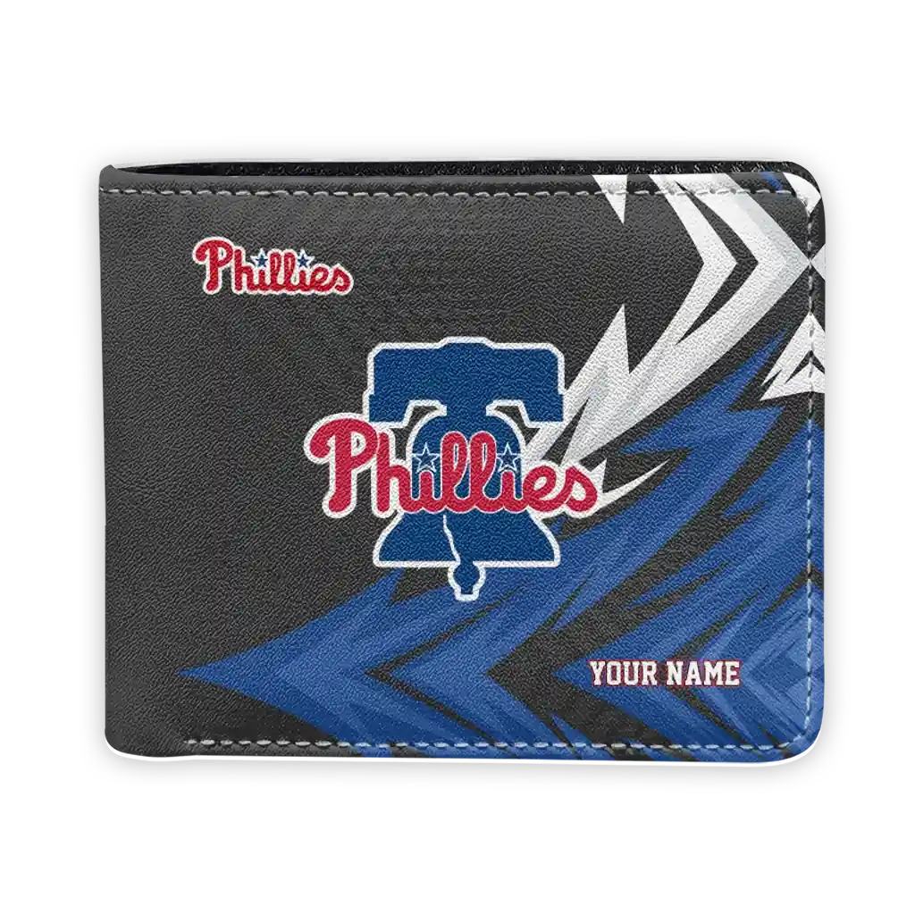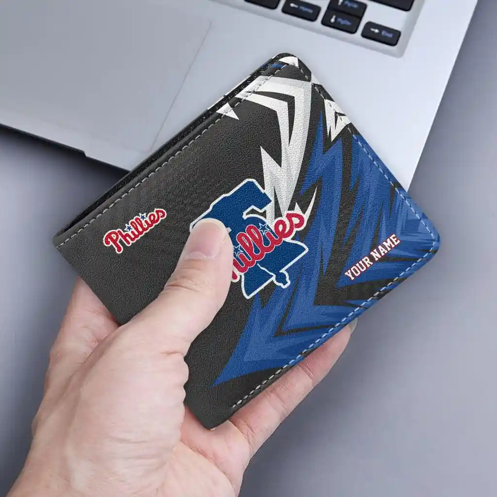 Hit a home run with Philadelphia Phillies by wearing the Personalized Philadelphia Phillies Sharp Arrow Streaks Blue Black Wallet. Featuring a bold team design and crafted with premium materials, this durable sports wallet offers plenty of space for your cards, cash, and game-day essentials. With a secure fold-over closure, it’s the perfect accessory for any die-hard fan ready to rep their team, from the dugout to the streets.