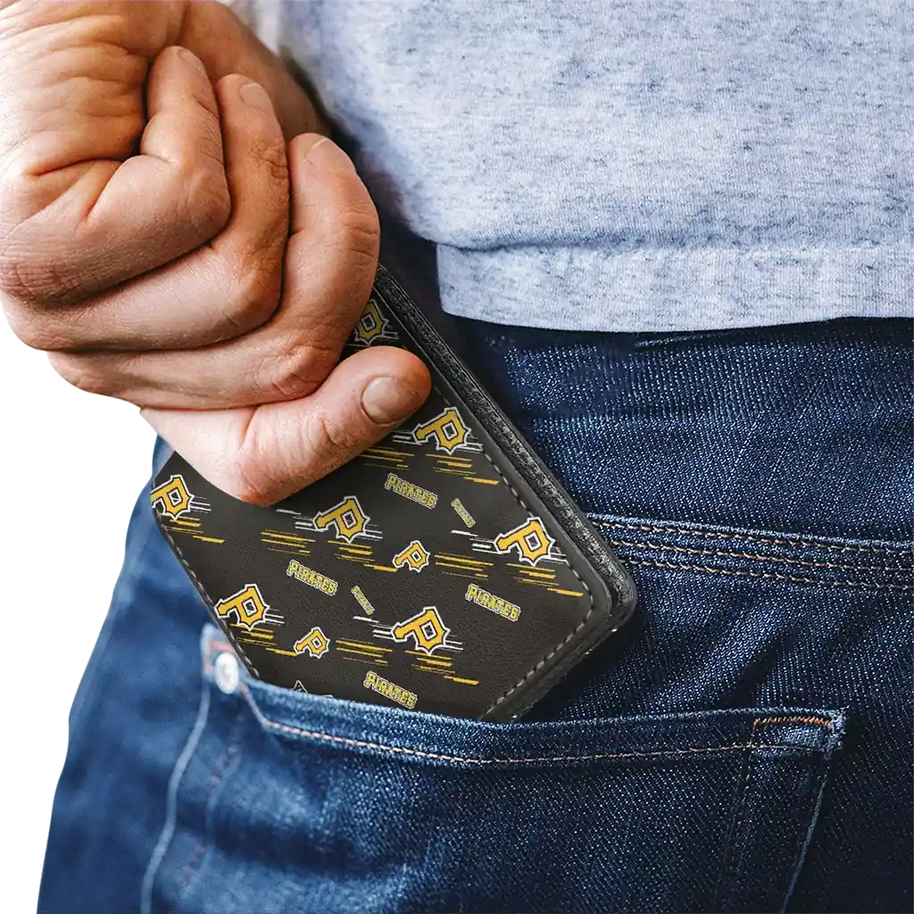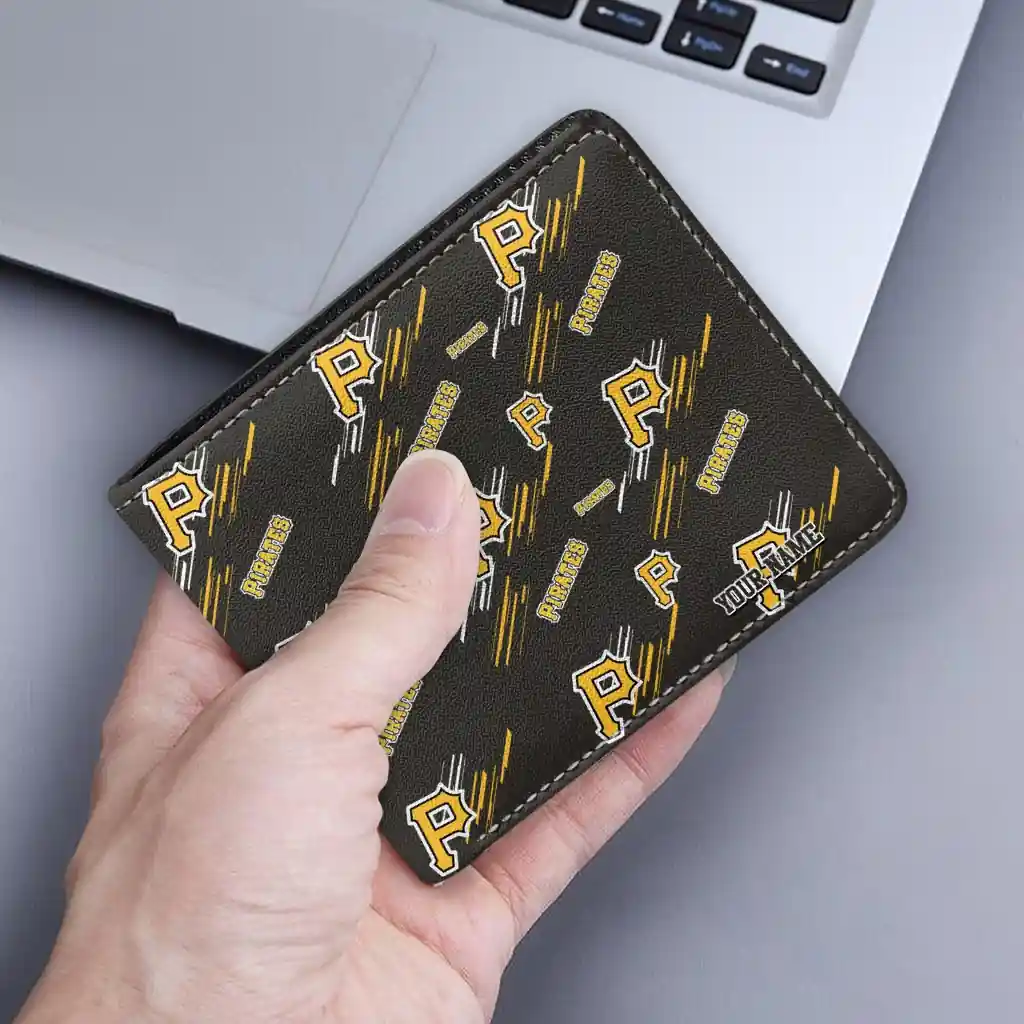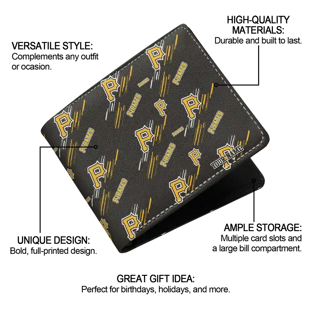 Hit a home run with Pittsburgh Pirates by wearing the Custom Pittsburgh Pirates Streak Motif Black Wallet. Featuring a bold team design and crafted with premium materials, this durable sports wallet offers plenty of space for your cards, cash, and game-day essentials. With a secure fold-over closure, it’s the perfect accessory for any die-hard fan ready to rep their team, from the dugout to the streets.