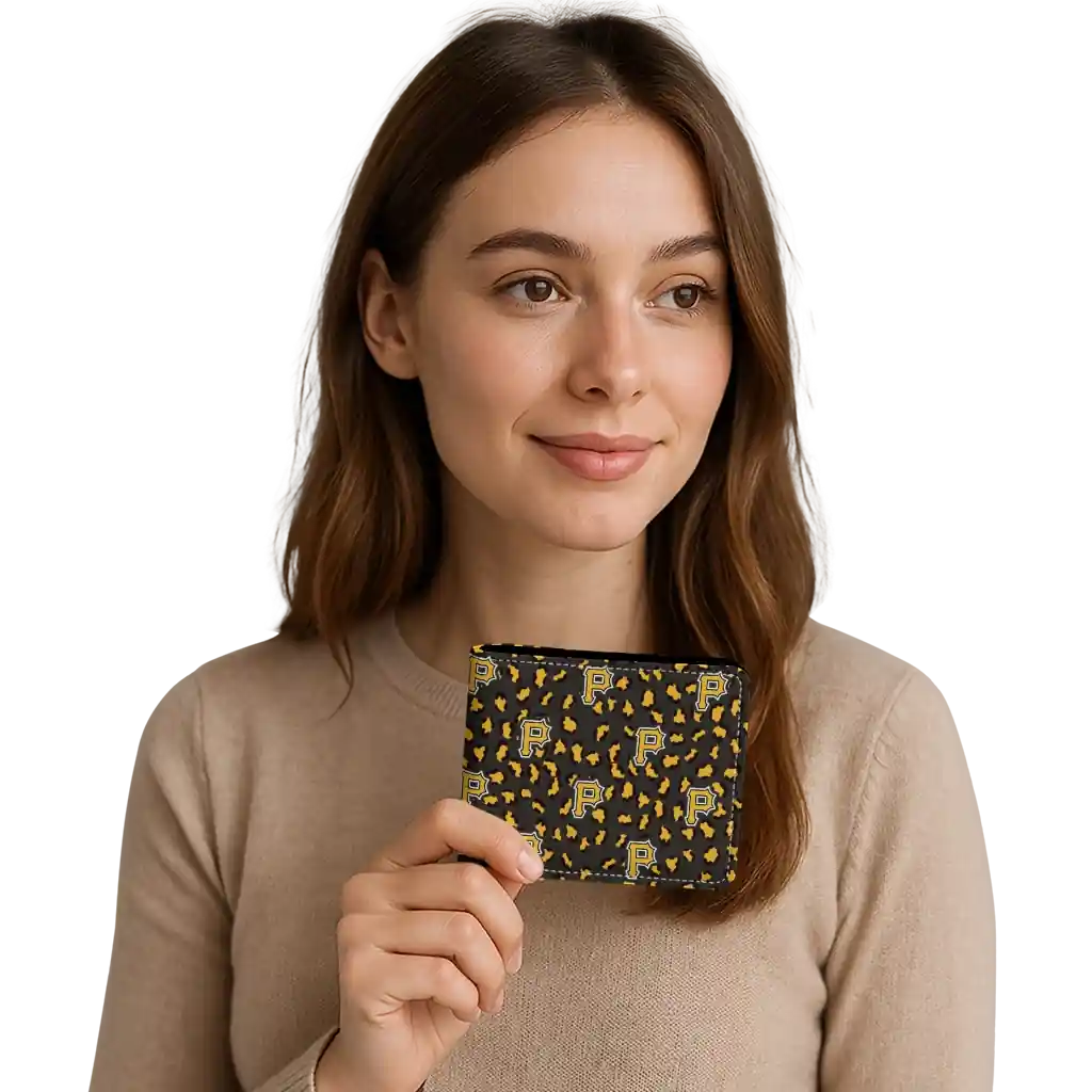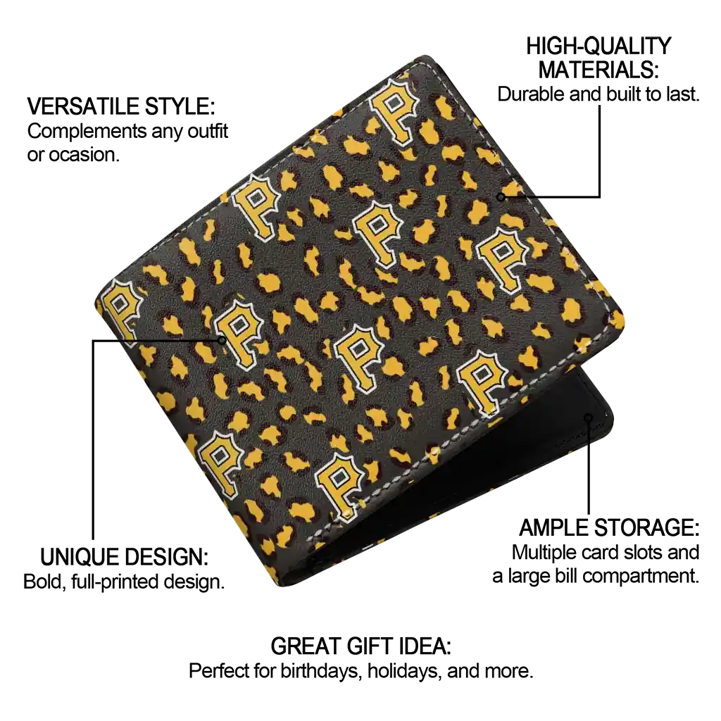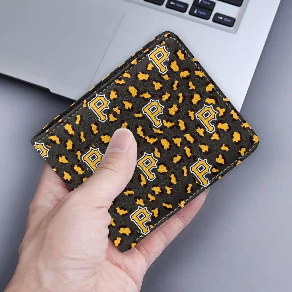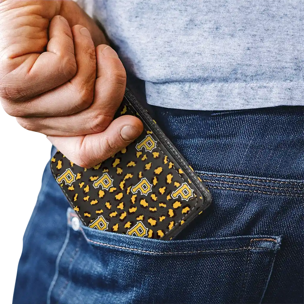 Hit a home run with Pittsburgh Pirates by wearing the Pittsburgh Pirates Leopard Texture Black Wallet. Featuring a bold team design and crafted with premium materials, this durable sports wallet offers plenty of space for your cards, cash, and game-day essentials. With a secure fold-over closure, it’s the perfect accessory for any die-hard fan ready to rep their team, from the dugout to the streets.