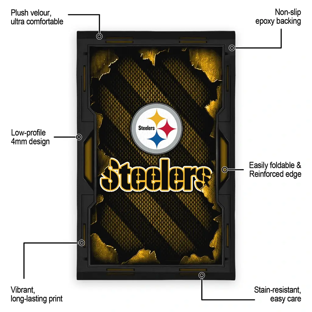 Hit a home run with your favorite team by displaying the Pittsburgh Steelers Rug – Personalized Torn Mesh Gold from MLB Fan Zone. Featuring a bold team design and crafted with plush velour, this durable sports rug offers ultimate comfort for your home or game-day fan cave. With a quality non-slip grip and stay-flat design, it’s the perfect accessory for any die-hard fan ready to rep their team from the living room to the clubhouse.
