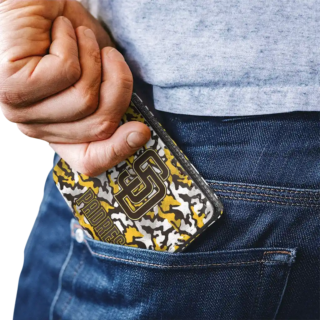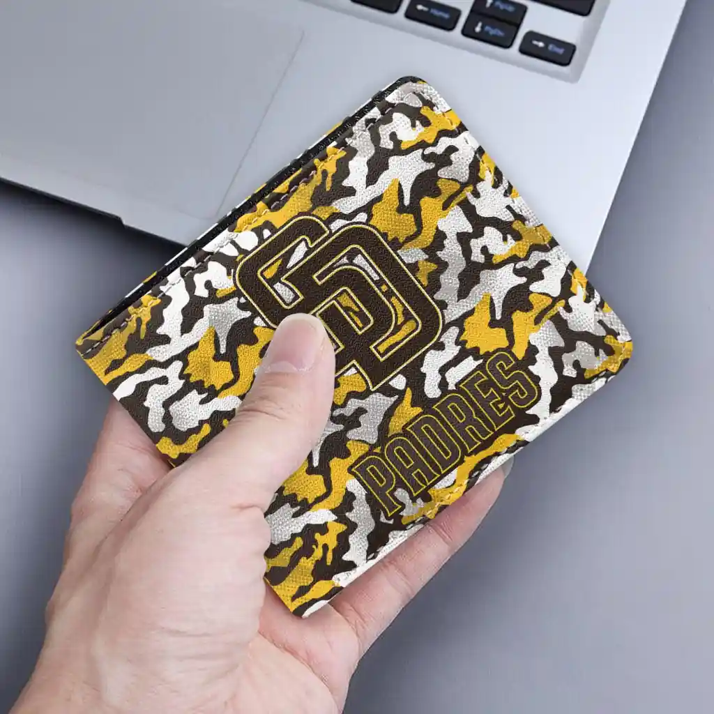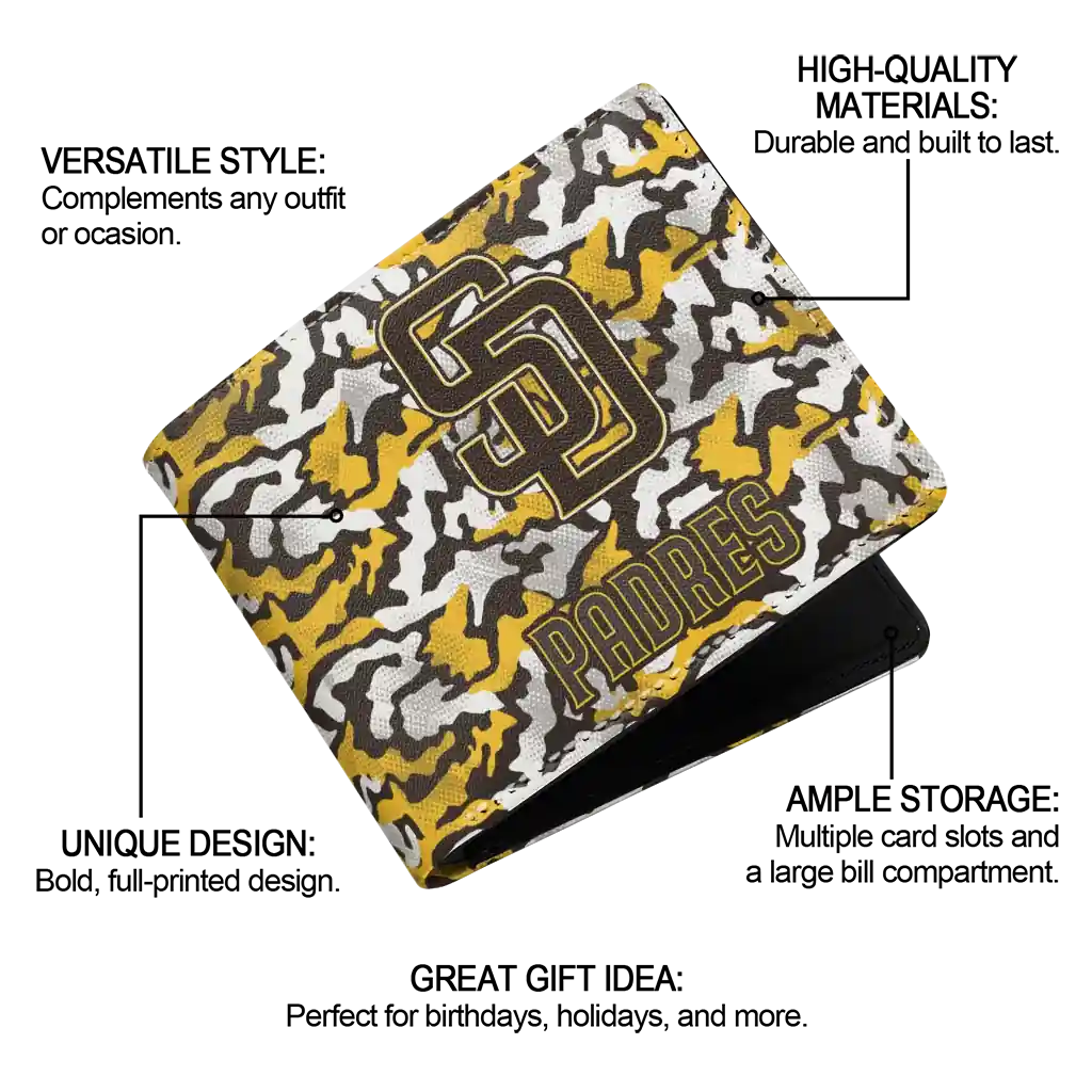 Hit a home run with San Diego Padres by wearing the San Diego Padres Camouflage Patches Brown White Wallet. Featuring a bold team design and crafted with premium materials, this durable sports wallet offers plenty of space for your cards, cash, and game-day essentials. With a secure fold-over closure, it’s the perfect accessory for any die-hard fan ready to rep their team, from the dugout to the streets.