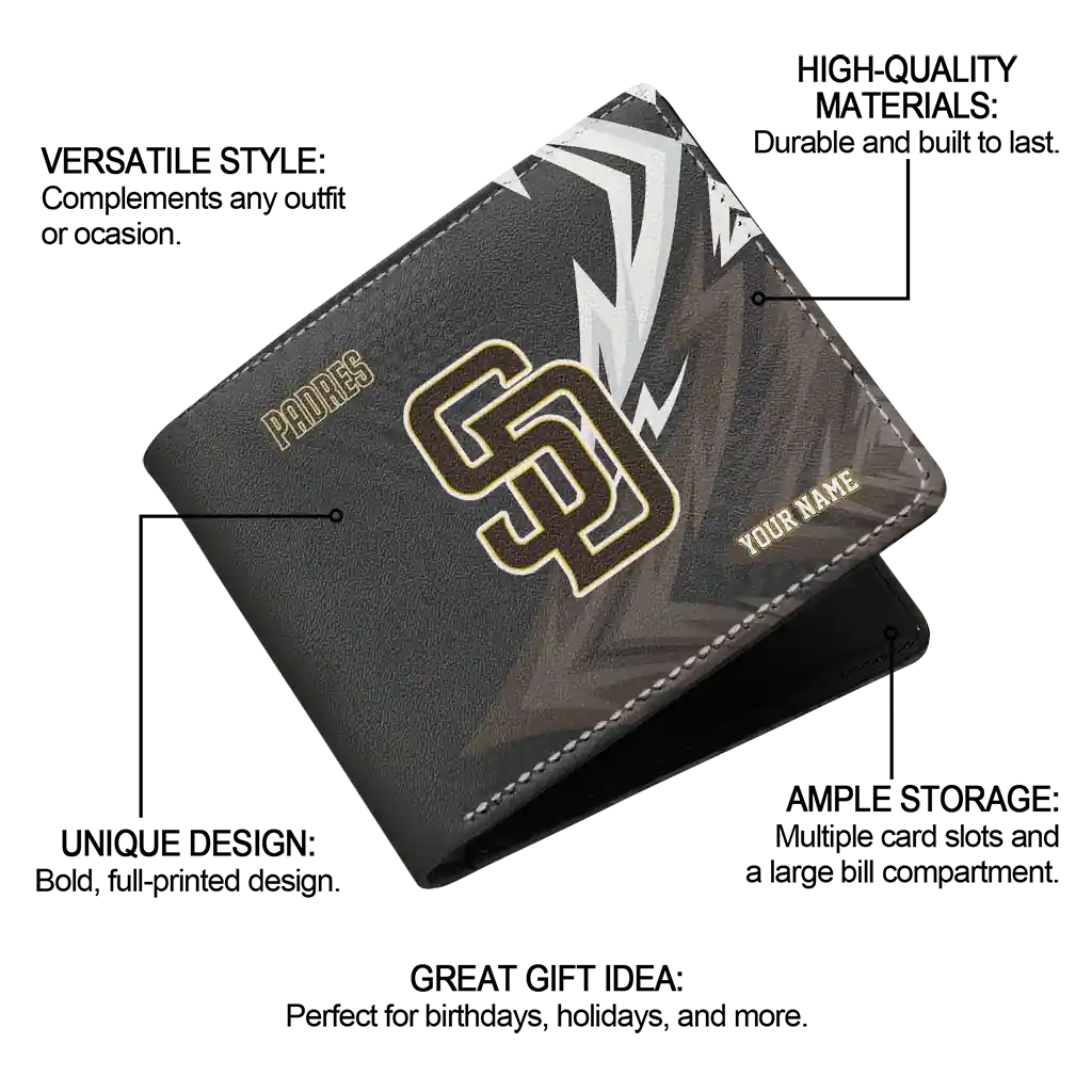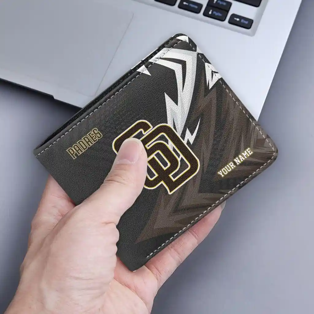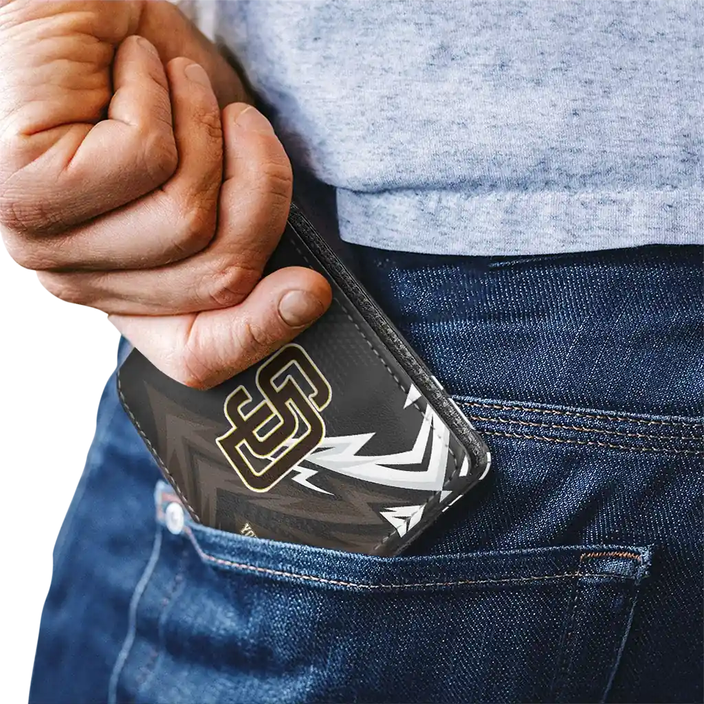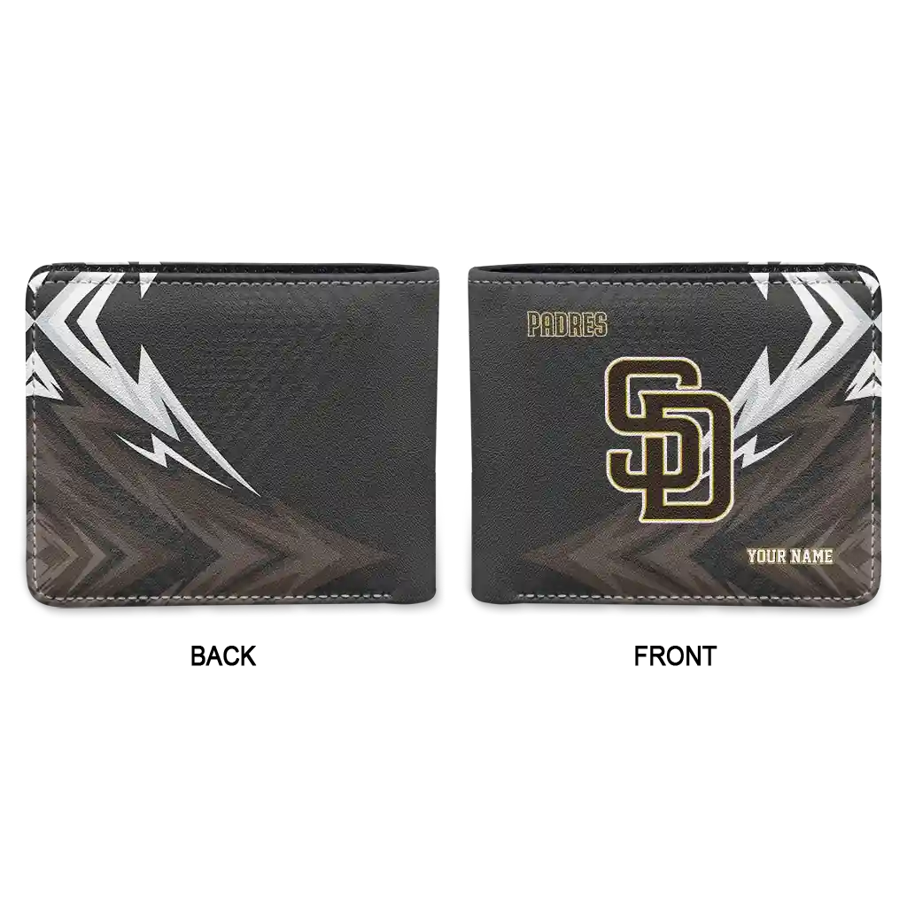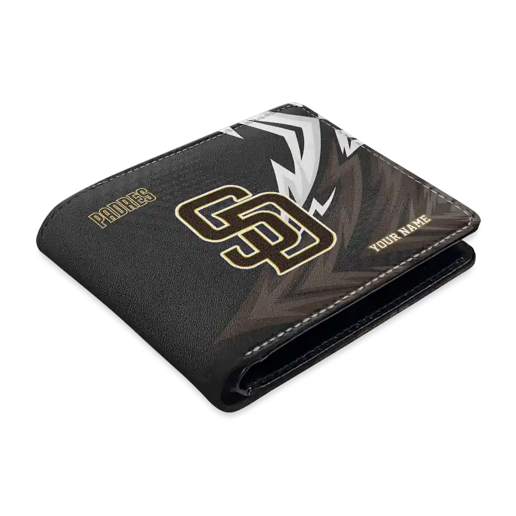 Hit a home run with San Diego Padres by wearing the Custom San Diego Padres Sharp Arrow Streaks Brown Black Wallet. Featuring a bold team design and crafted with premium materials, this durable sports wallet offers plenty of space for your cards, cash, and game-day essentials. With a secure fold-over closure, it’s the perfect accessory for any die-hard fan ready to rep their team, from the dugout to the streets.
