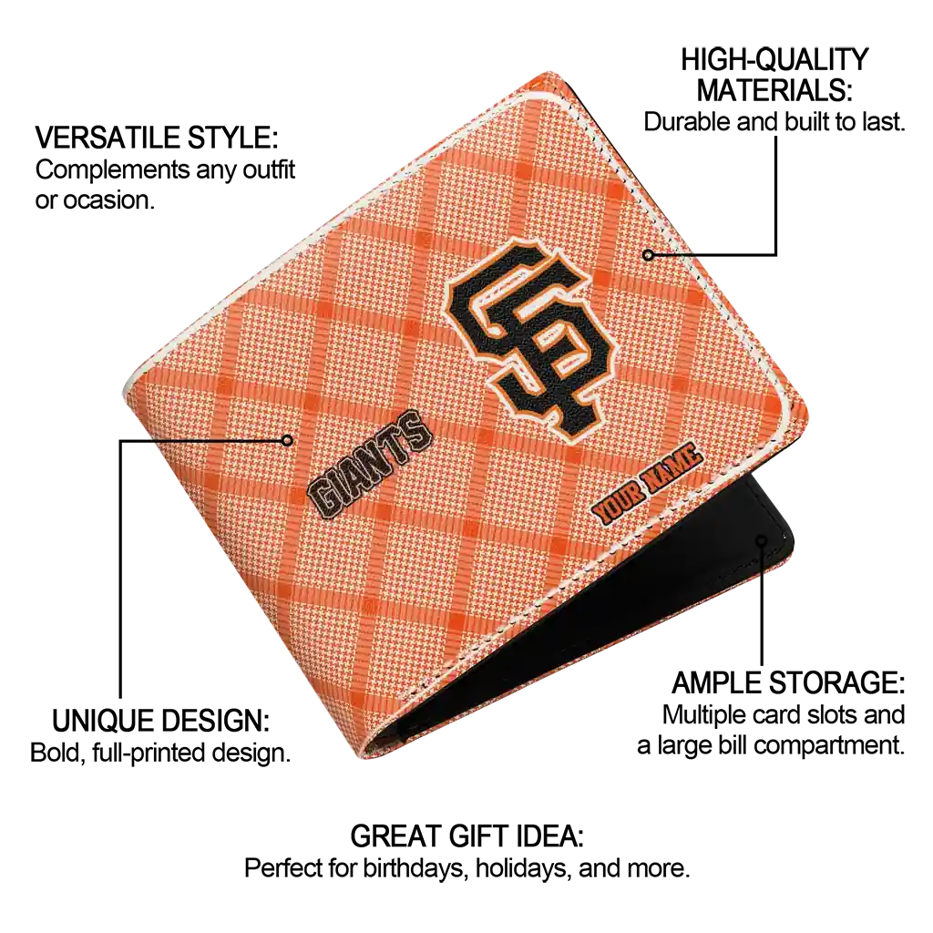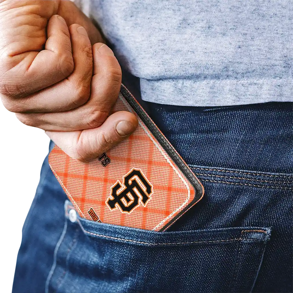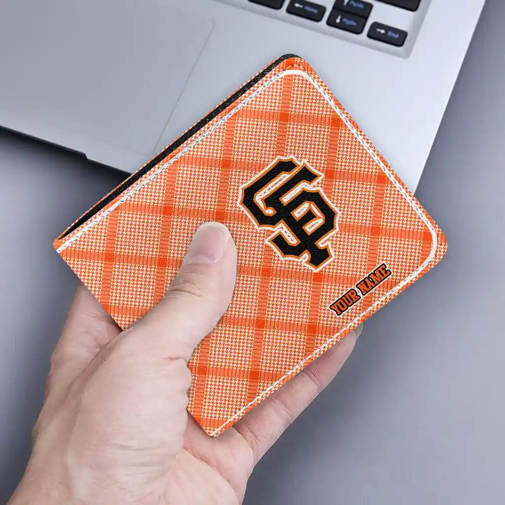 Hit a home run with San Francisco Giants by wearing the Custom San Francisco Giants Plaid Grid Orange Wallet. Featuring a bold team design and crafted with premium materials, this durable sports wallet offers plenty of space for your cards, cash, and game-day essentials. With a secure fold-over closure, it’s the perfect accessory for any die-hard fan ready to rep their team, from the dugout to the streets.