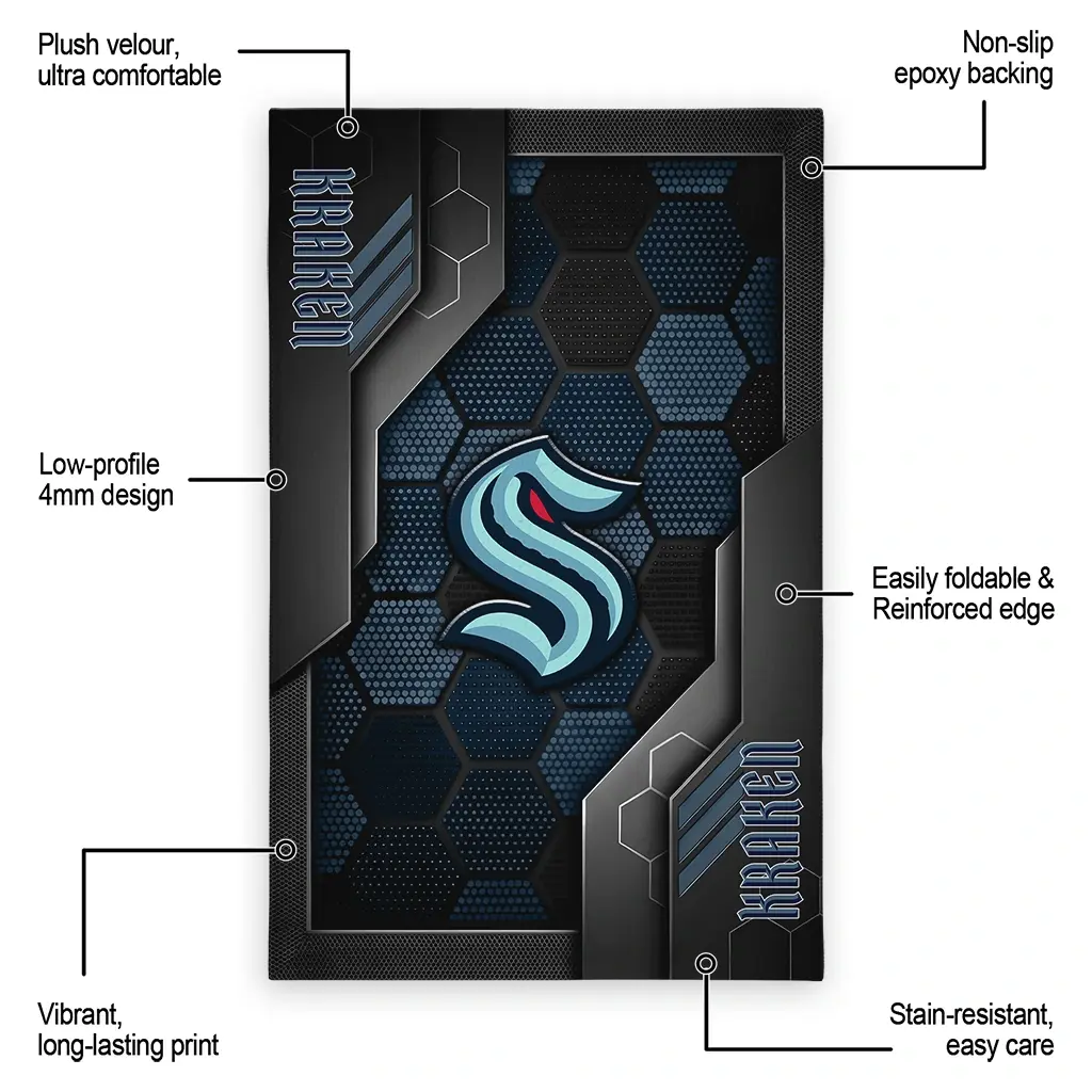 Hit a home run with your favorite team by displaying the Seattle Kraken Rug – Custom Hexagonal Grid Pattern Blue from MLB Fan Zone. Featuring a bold team design and crafted with plush velour, this durable sports rug offers ultimate comfort for your home or game-day fan cave. With a quality non-slip grip and stay-flat design, it’s the perfect accessory for any die-hard fan ready to rep their team from the living room to the clubhouse.