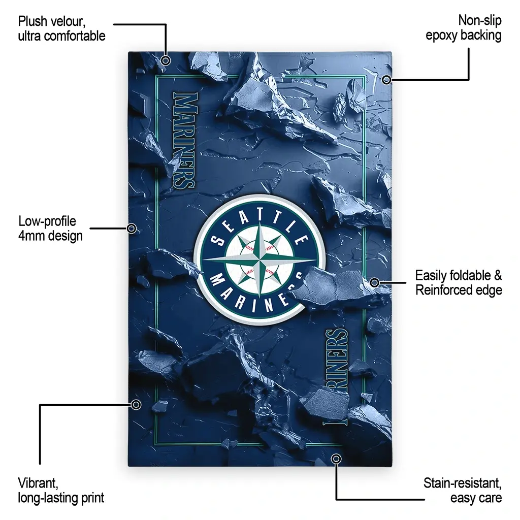 Hit a home run with your favorite team by displaying the Seattle Mariners Rug – Customized Cracked Surface Design Navy Blue from MLB Fan Zone. Featuring a bold team design and crafted with plush velour, this durable sports rug offers ultimate comfort for your home or game-day fan cave. With a quality non-slip grip and stay-flat design, it’s the perfect accessory for any die-hard fan ready to rep their team from the living room to the clubhouse.