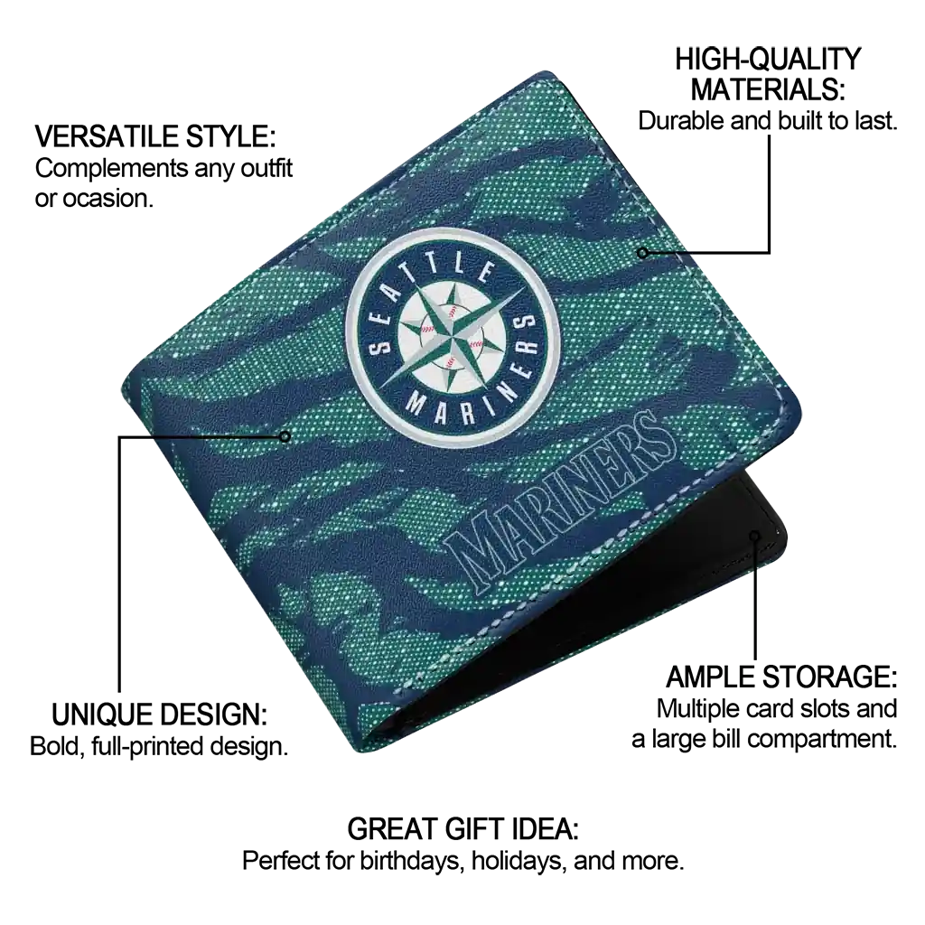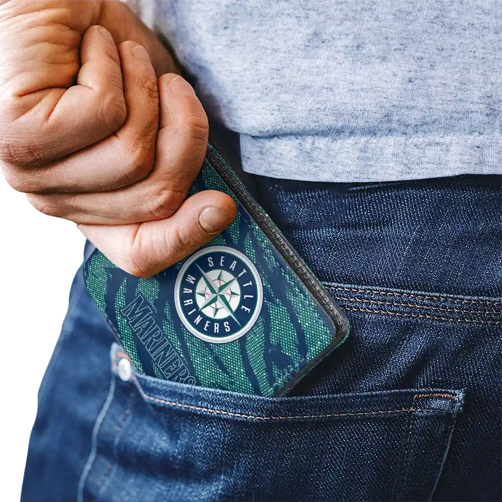Hit a home run with Seattle Mariners by wearing the Seattle Mariners Abstract Stripes Navy Blue Wallet. Featuring a bold team design and crafted with premium materials, this durable sports wallet offers plenty of space for your cards, cash, and game-day essentials. With a secure fold-over closure, it’s the perfect accessory for any die-hard fan ready to rep their team, from the dugout to the streets.