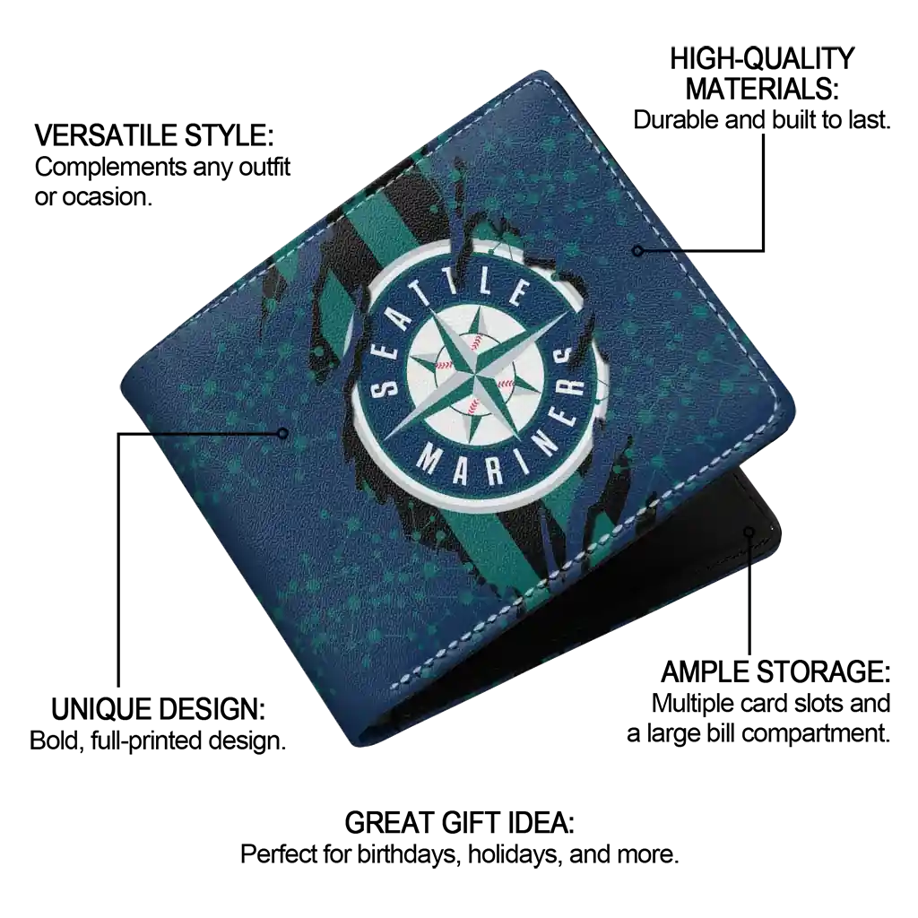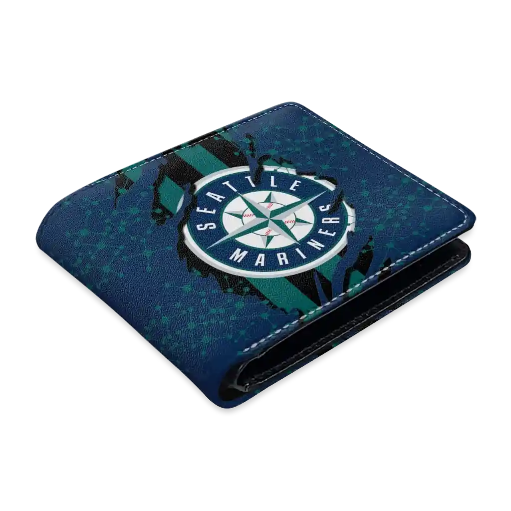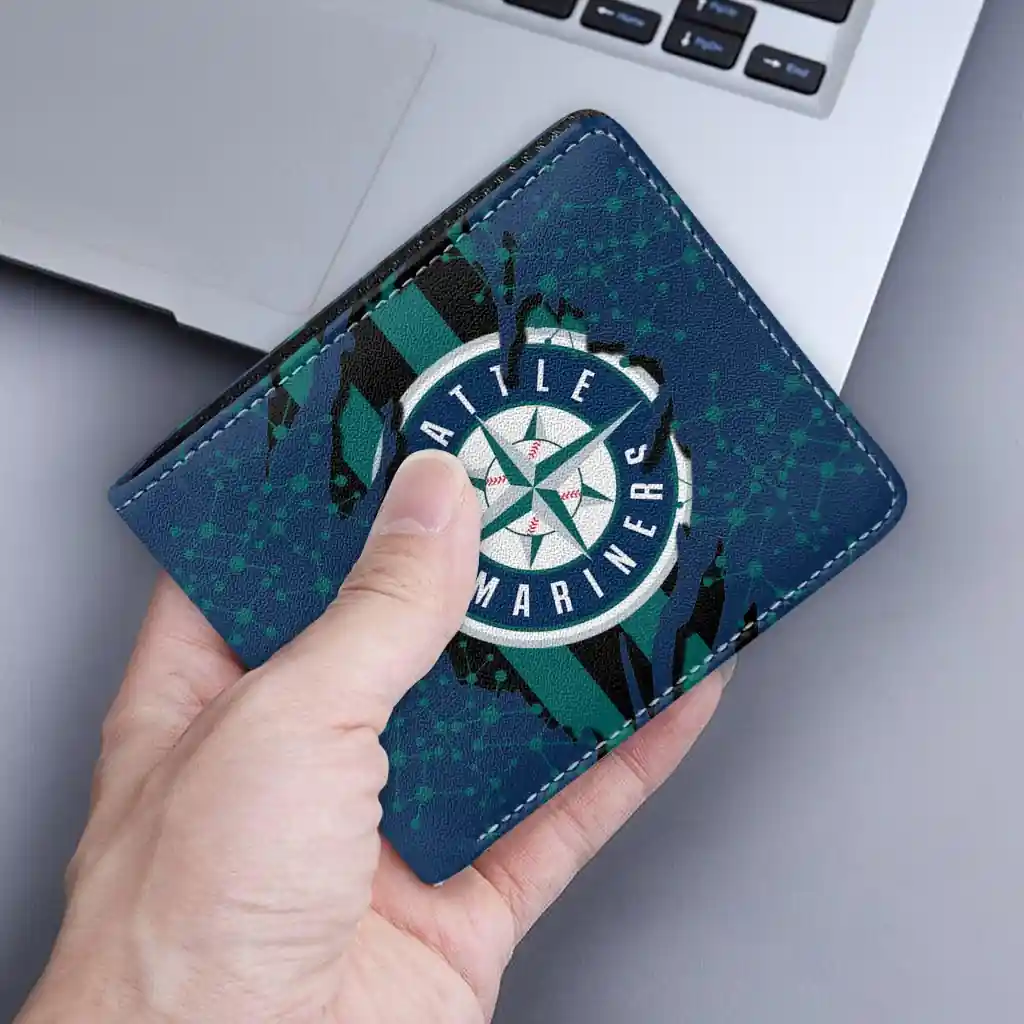 Hit a home run with Seattle Mariners by wearing the Seattle Mariners Torn Stripe Chaos Navy Blue Black Wallet. Featuring a bold team design and crafted with premium materials, this durable sports wallet offers plenty of space for your cards, cash, and game-day essentials. With a secure fold-over closure, it’s the perfect accessory for any die-hard fan ready to rep their team, from the dugout to the streets.