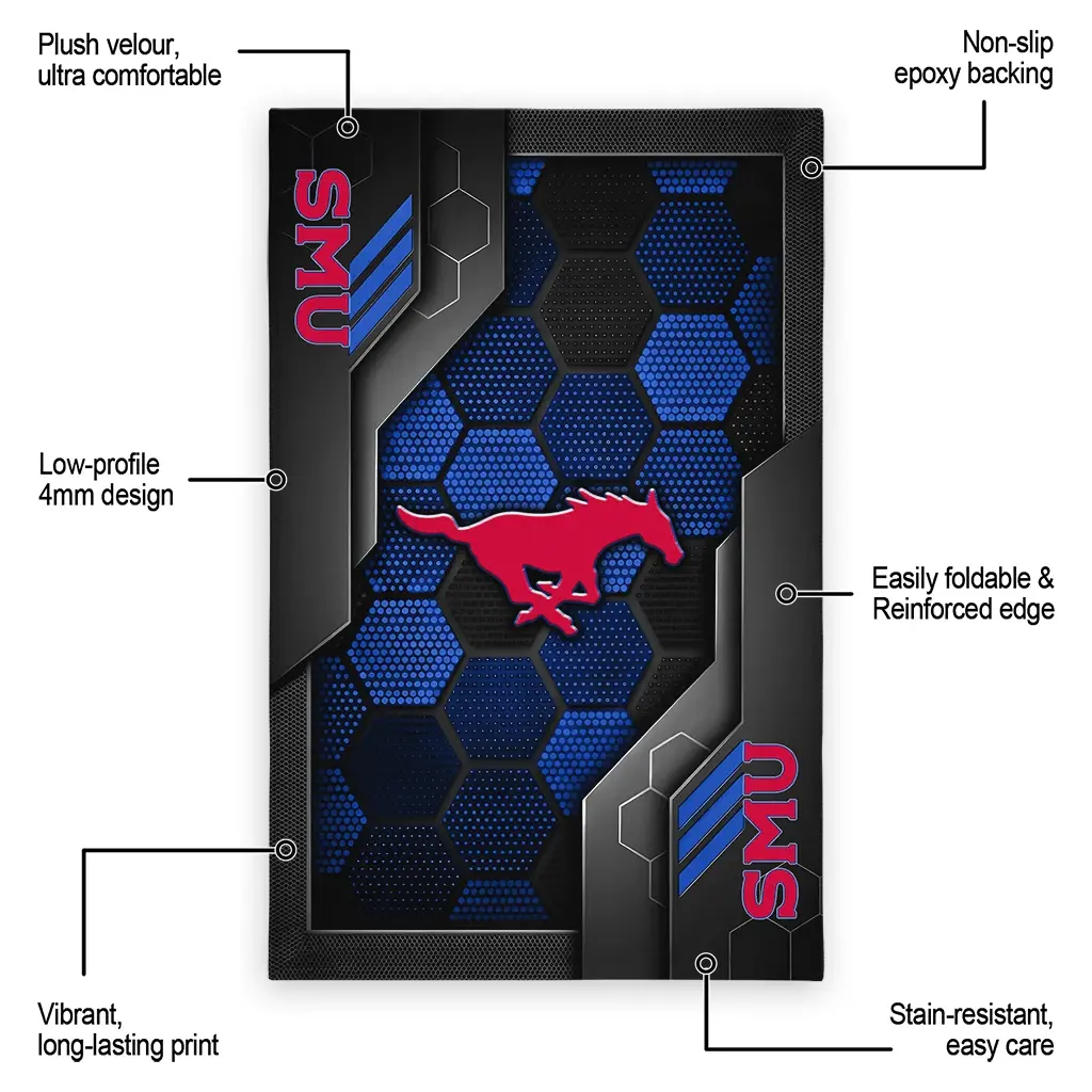 Hit a home run with your favorite team by displaying the SMU Mustangs Rug – Custom Hexagonal Grid Pattern Blue from MLB Fan Zone. Featuring a bold team design and crafted with plush velour, this durable sports rug offers ultimate comfort for your home or game-day fan cave. With a quality non-slip grip and stay-flat design, it’s the perfect accessory for any die-hard fan ready to rep their team from the living room to the clubhouse.