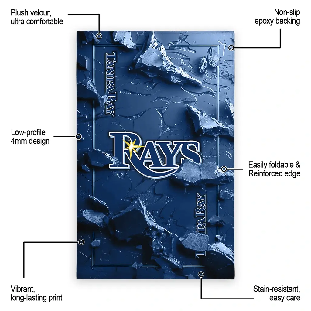 Hit a home run with your favorite team by displaying the Tampa Bay Rays Rug – Custom Cracked Surface Design Navy from MLB Fan Zone. Featuring a bold team design and crafted with plush velour, this durable sports rug offers ultimate comfort for your home or game-day fan cave. With a quality non-slip grip and stay-flat design, it’s the perfect accessory for any die-hard fan ready to rep their team from the living room to the clubhouse.