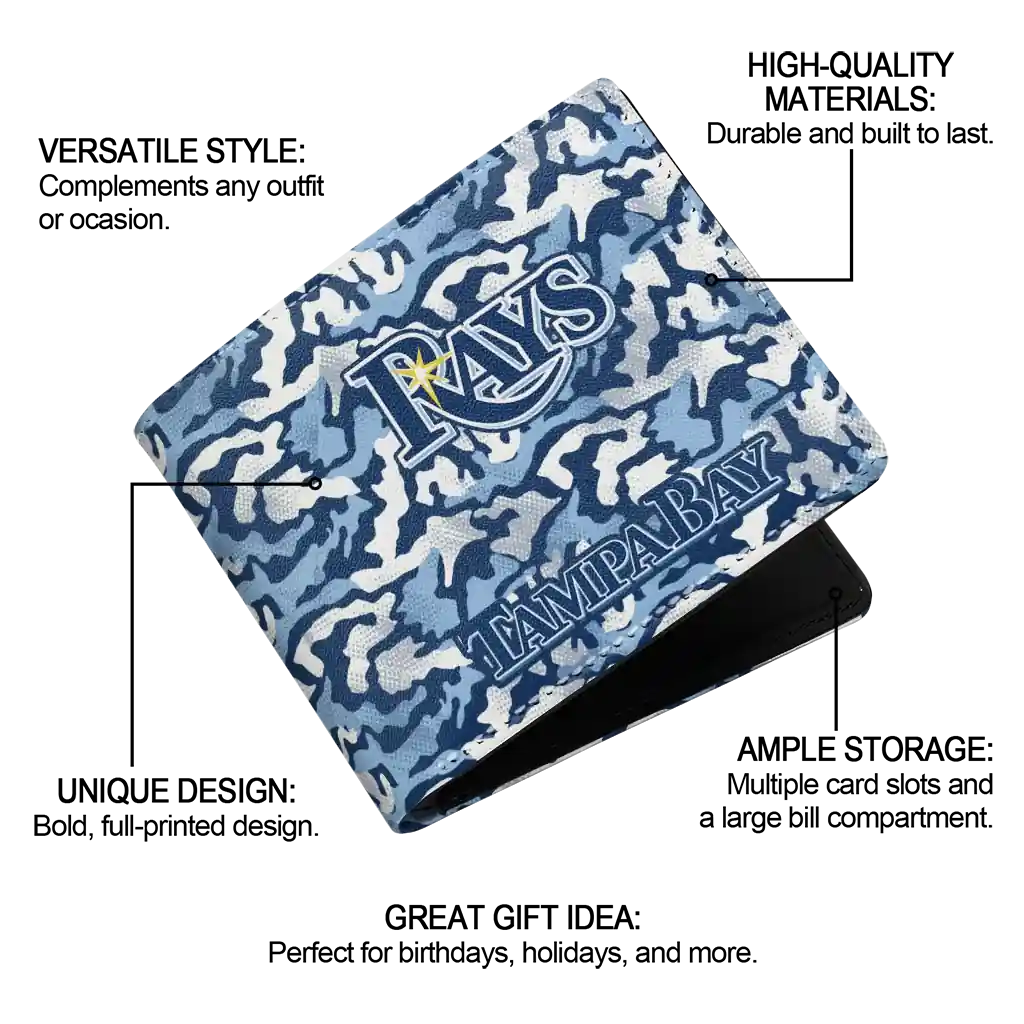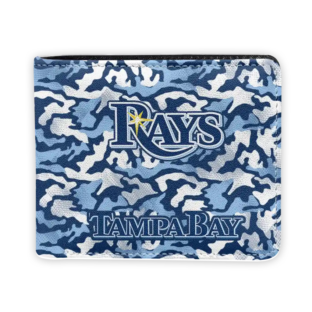 Hit a home run with Tampa Bay Rays by wearing the Tampa Bay Rays Camouflage Patches Navy White Wallet. Featuring a bold team design and crafted with premium materials, this durable sports wallet offers plenty of space for your cards, cash, and game-day essentials. With a secure fold-over closure, it’s the perfect accessory for any die-hard fan ready to rep their team, from the dugout to the streets.