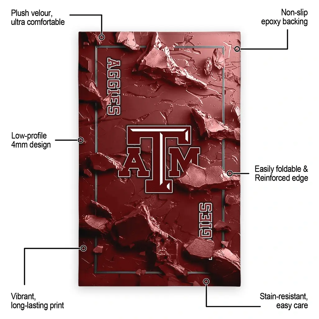 Hit a home run with your favorite team by displaying the Texas A&M Aggies Rug – Customized Cracked Surface Design Maroon from MLB Fan Zone. Featuring a bold team design and crafted with plush velour, this durable sports rug offers ultimate comfort for your home or game-day fan cave. With a quality non-slip grip and stay-flat design, it’s the perfect accessory for any die-hard fan ready to rep their team from the living room to the clubhouse.