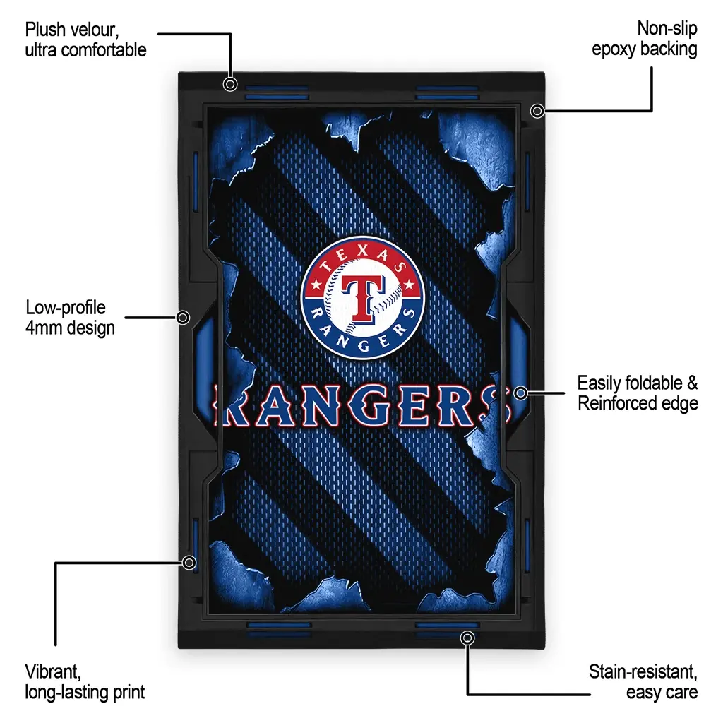 Hit a home run with your favorite team by displaying the Texas Rangers Rug – Personalized Torn Mesh Blue from MLB Fan Zone. Featuring a bold team design and crafted with plush velour, this durable sports rug offers ultimate comfort for your home or game-day fan cave. With a quality non-slip grip and stay-flat design, it’s the perfect accessory for any die-hard fan ready to rep their team from the living room to the clubhouse.