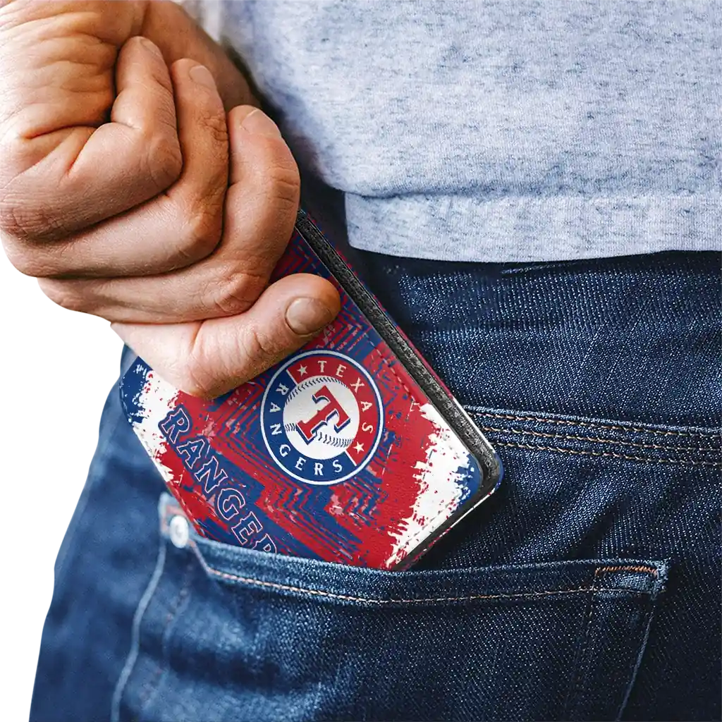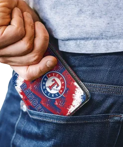 Hit a home run with Texas Rangers by wearing the Texas Rangers Blue White Wallet. Featuring a bold team design and crafted with premium materials, this durable sports wallet offers plenty of space for your cards, cash, and game-day essentials. With a secure fold-over closure, it’s the perfect accessory for any die-hard fan ready to rep their team, from the dugout to the streets.
