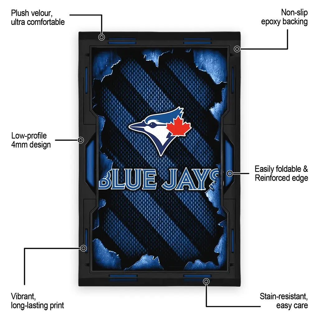 Hit a home run with your favorite team by displaying the Toronto Blue Jays Rug – Custom Torn Mesh Blue from MLB Fan Zone. Featuring a bold team design and crafted with plush velour, this durable sports rug offers ultimate comfort for your home or game-day fan cave. With a quality non-slip grip and stay-flat design, it’s the perfect accessory for any die-hard fan ready to rep their team from the living room to the clubhouse.