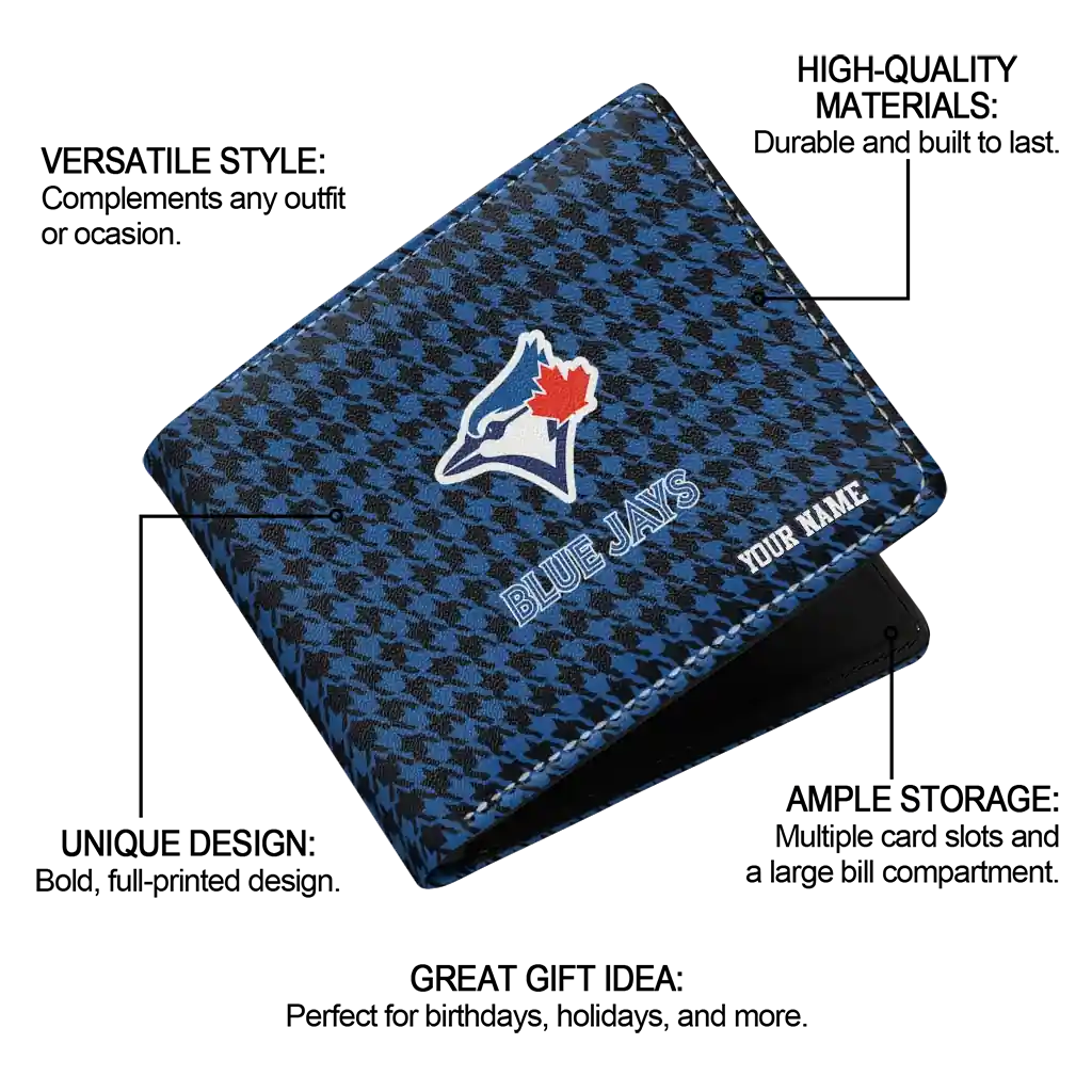 Hit a home run with Toronto Blue Jays by wearing the Customized Toronto Blue Jays Classic Houndstooth Blue Wallet. Featuring a bold team design and crafted with premium materials, this durable sports wallet offers plenty of space for your cards, cash, and game-day essentials. With a secure fold-over closure, it’s the perfect accessory for any die-hard fan ready to rep their team, from the dugout to the streets.